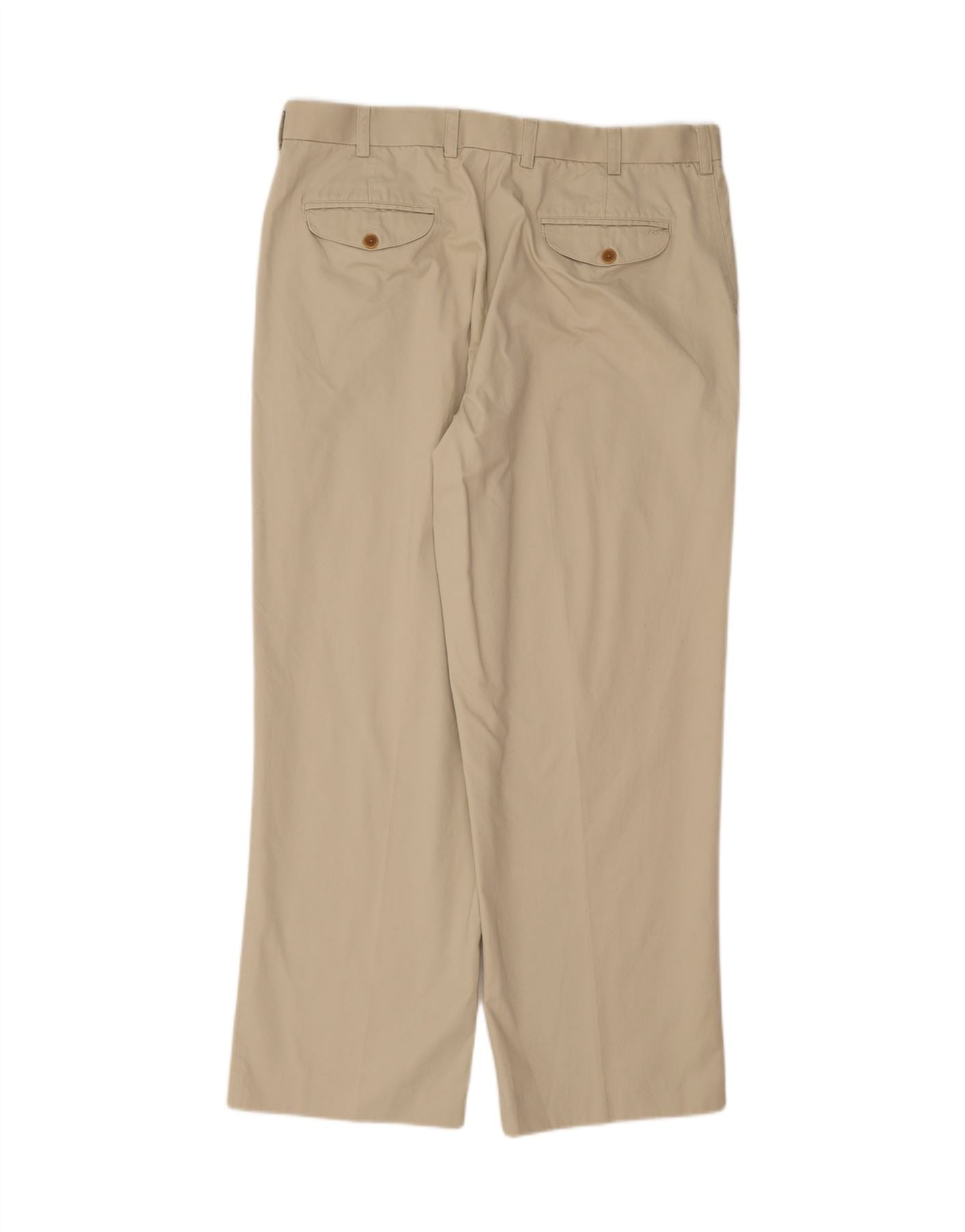- AI Description: Izod Mens Chino Trousers in beige. Crafted from 100% cotton, exclusive of ornamentation. These woven trousers feature a relaxed fit with a button closure. Designed with pockets for added convenience. See reverse for care and washing instructions. Made in Bangladesh.