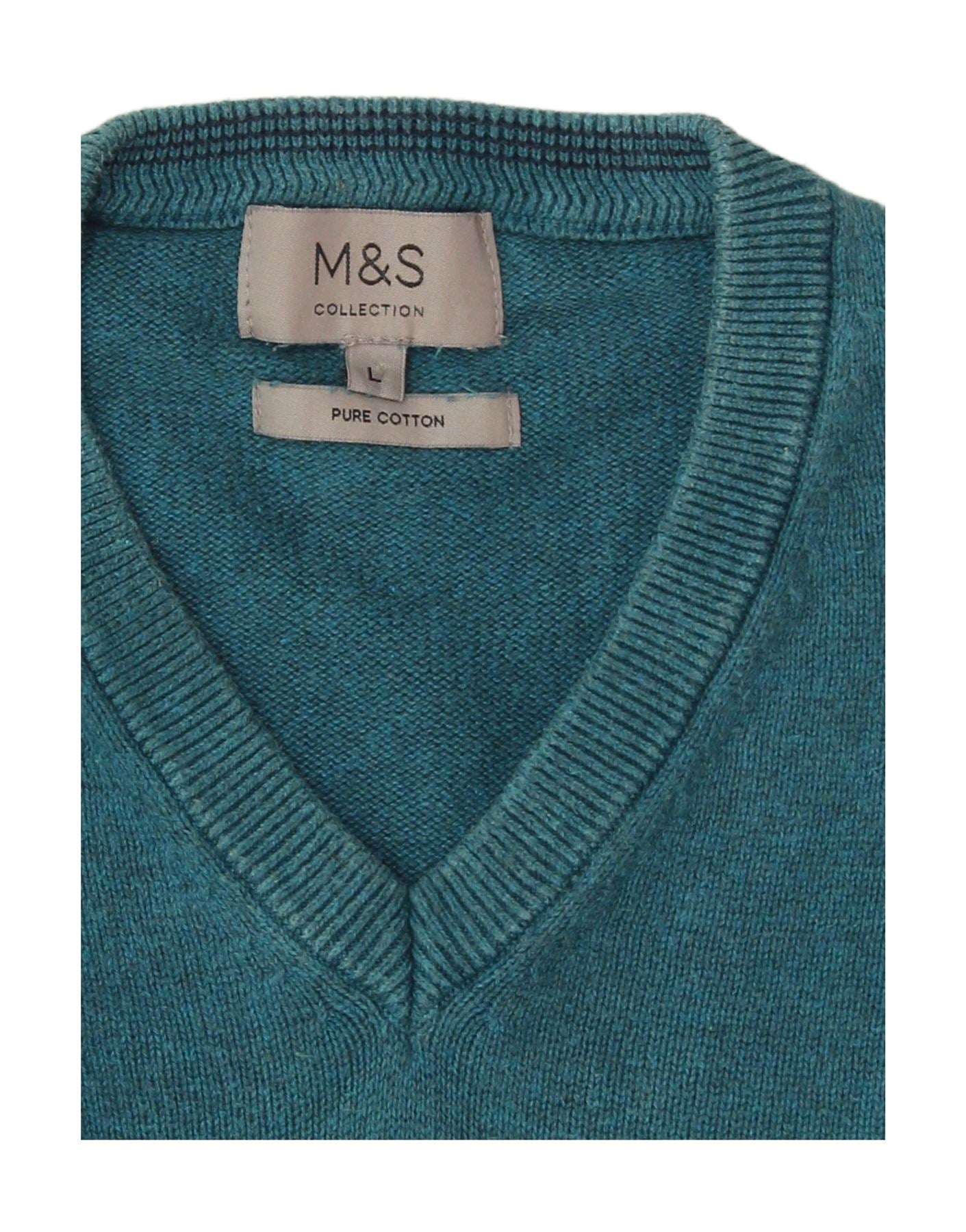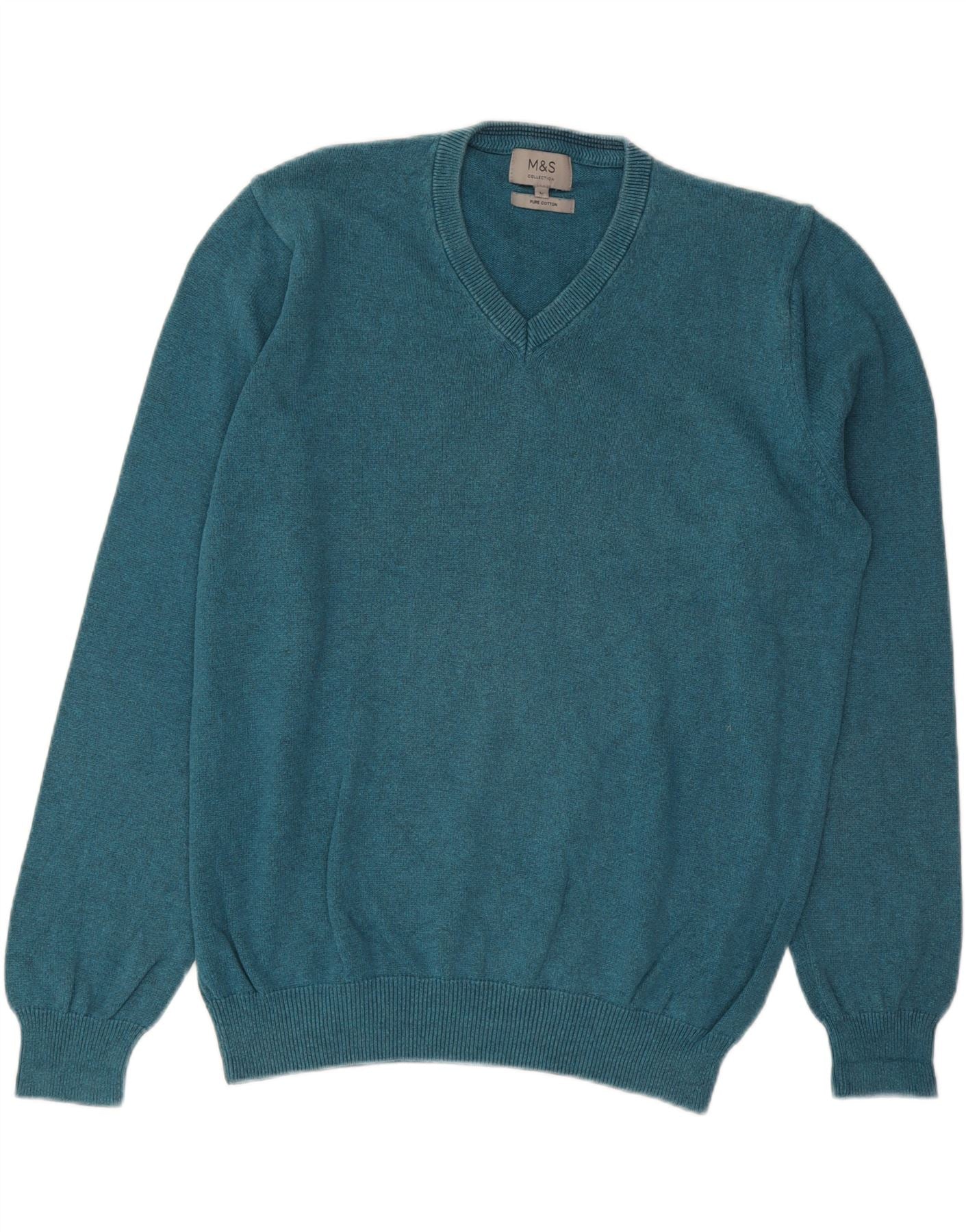 MARKS & SPENCER Mens V-Neck Jumper Sweater Large Blue Cotton