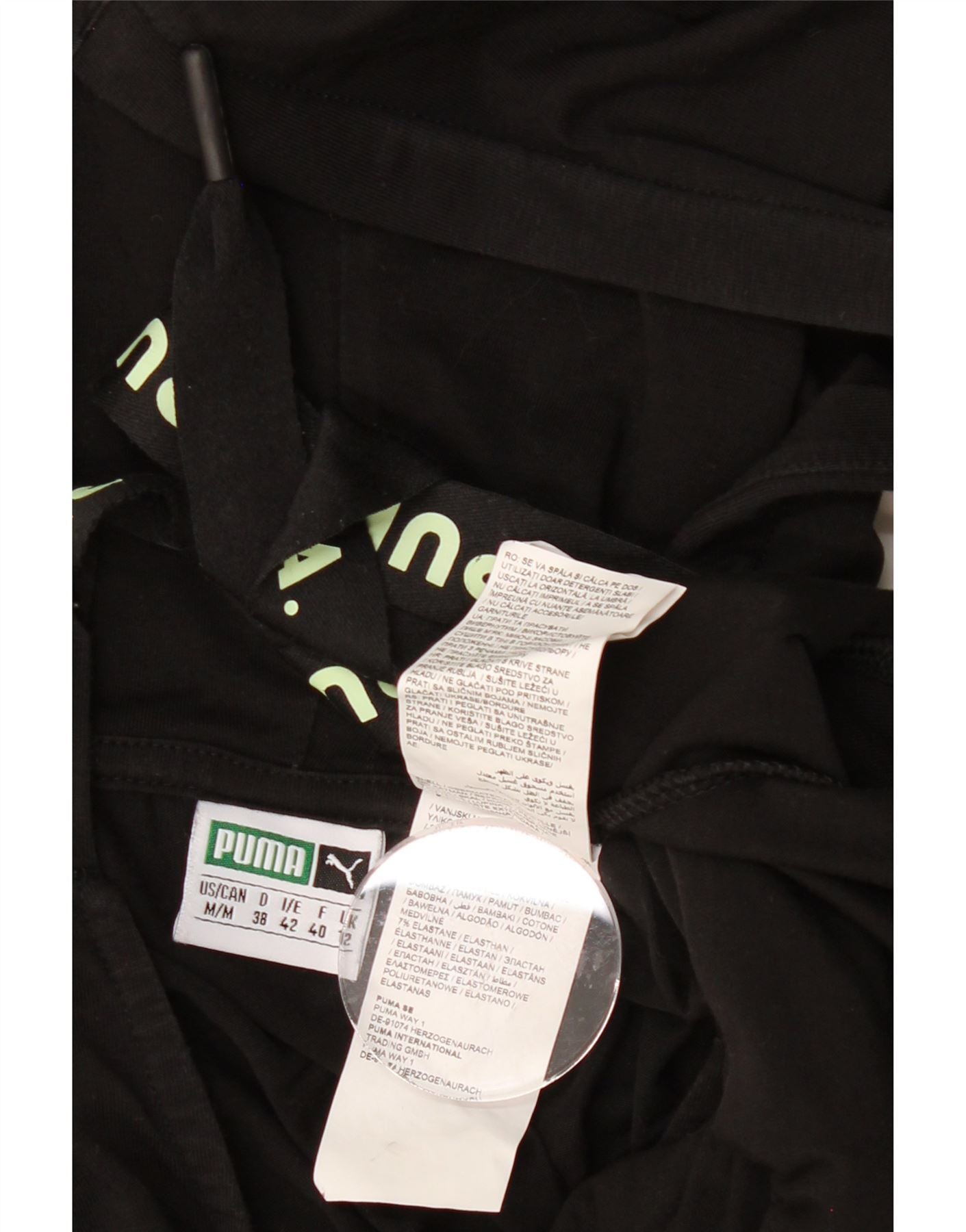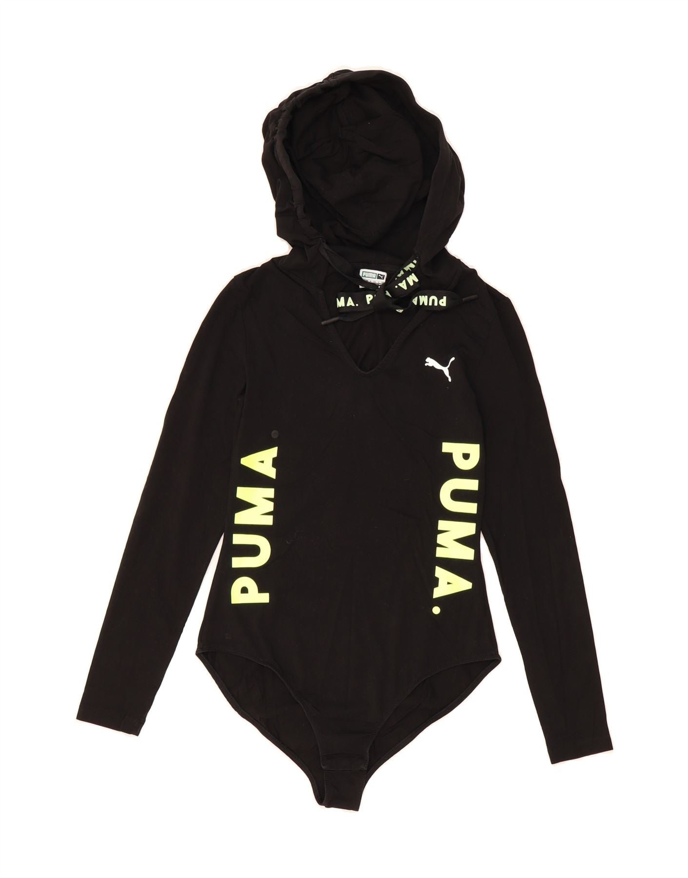 - AI Description: This pre-owned Puma bodysuit offers a sporty aesthetic. Crafted from a comfortable knit cotton blend with added stretch, it features long sleeves, a V-neckline, and a regular fit. The black bodysuit includes a hooded feature and subtle logo accent. A pullover closure ensures easy wear. In excellent condition. Label size M/M 38 42. Recommended retail price: £35.00.