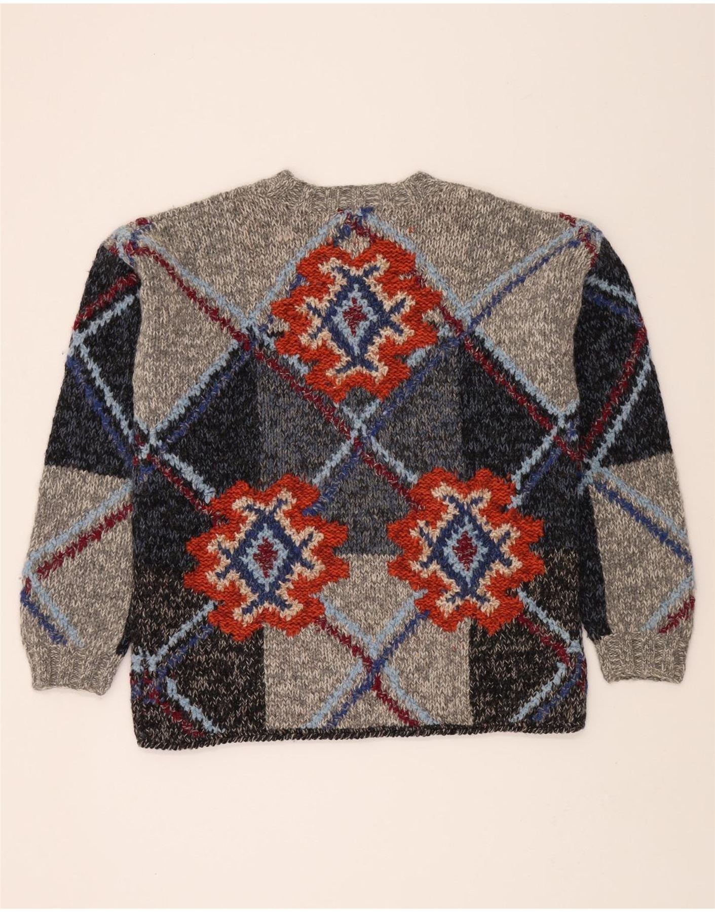 - AI Description: This stylish men's jumper from The West End features a retro design with an argyle/diamond pattern. Crafted from a wool blend (98% Lana-Laine, 1% Acrilico-Acrylique, 1% Cotton-Baumwolle) in grey knit fabric, it offers a regular fit and a round neckline. The jumper has long sleeves and an embroidered accent. Pre-owned in excellent condition, it shows minor visible wear throughout. Closure is pullover.