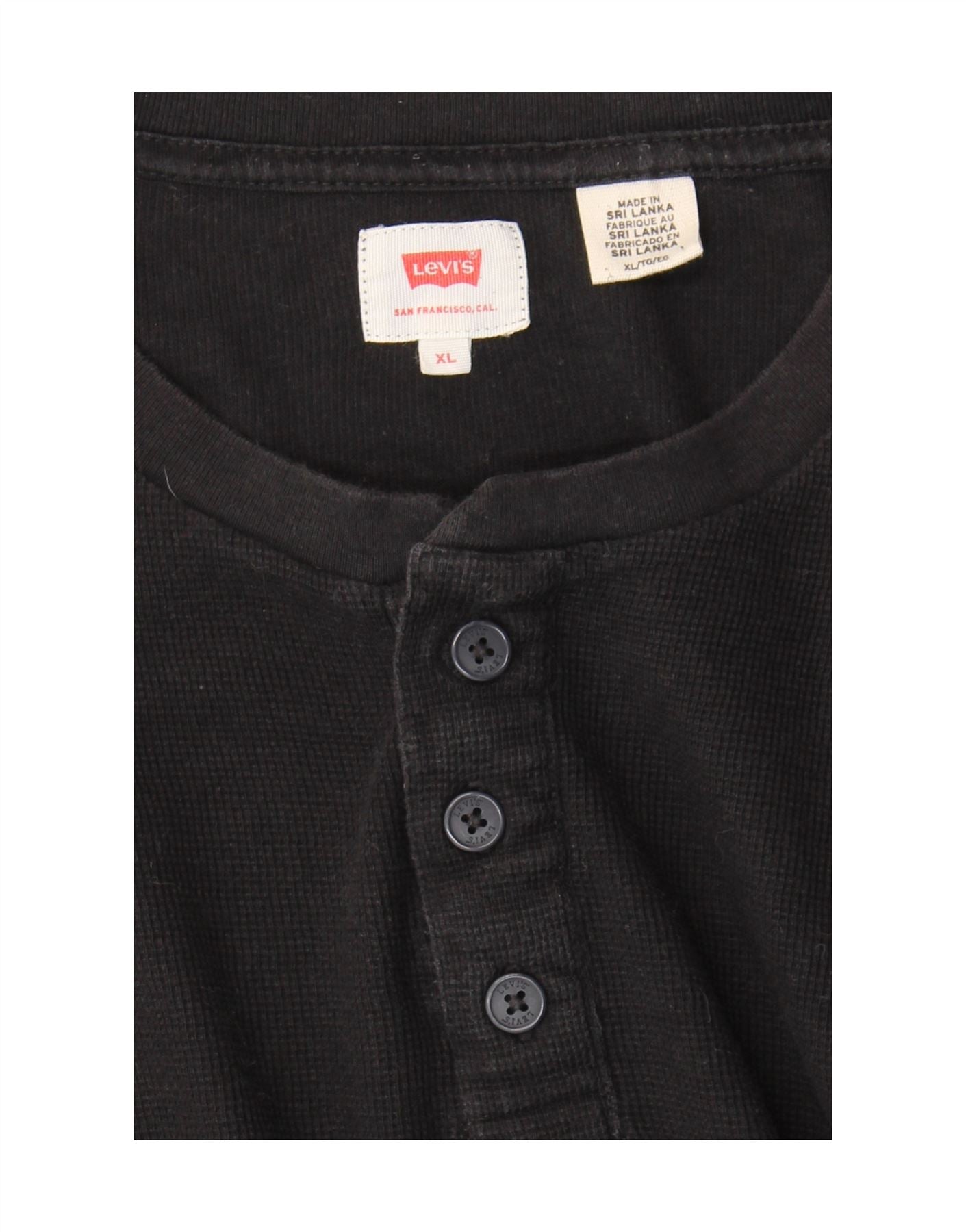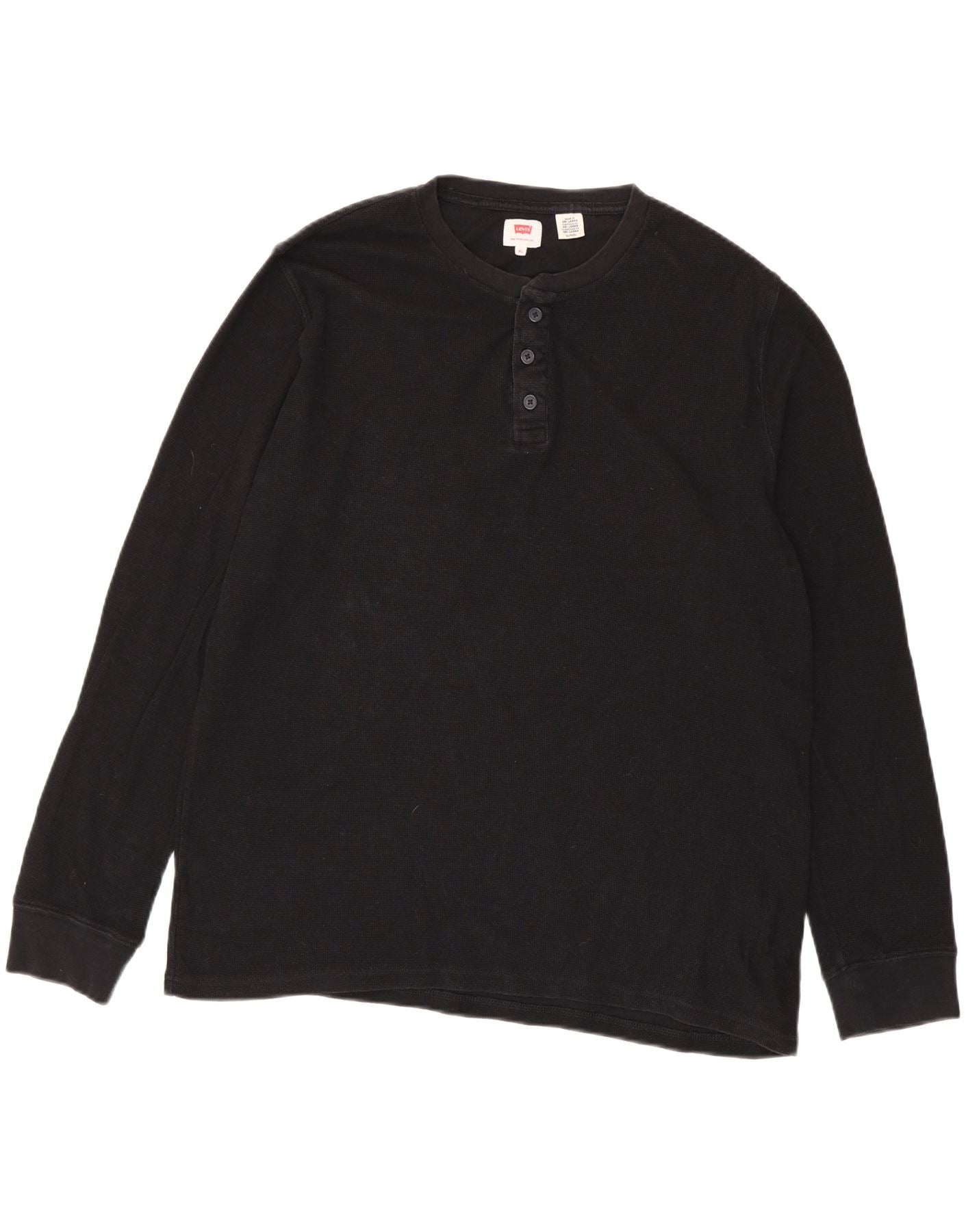 - AI Description: This pre-owned Levi's long-sleeved T-shirt is in excellent condition. Crafted in Sri Lanka from a knit fabric, this black, regular fit tee features a round neck and button closure. The label size is XL, and it boasts a regular fit design. A versatile addition to any man's wardrobe.