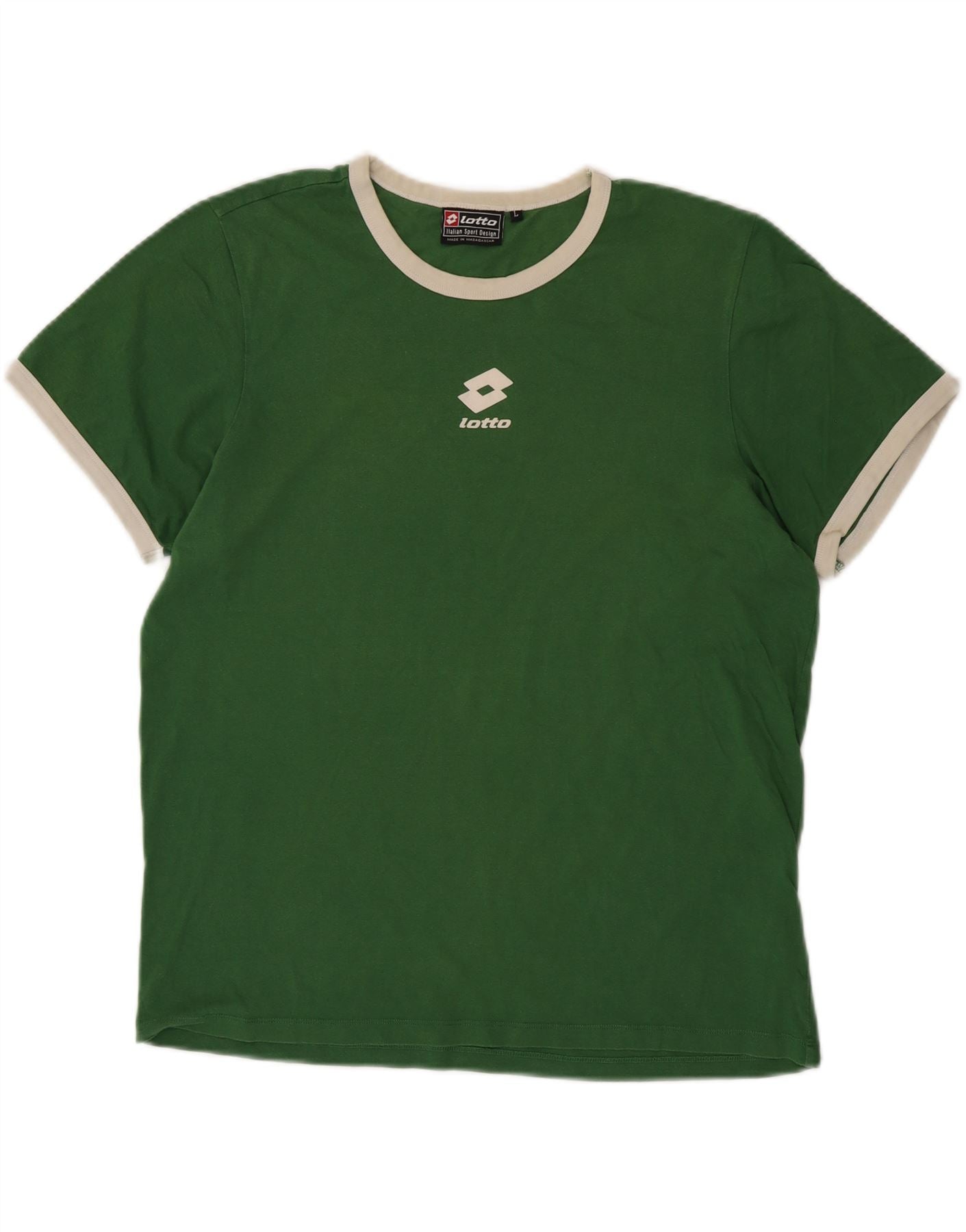 - AI Description: This Lotto men's T-shirt is a versatile addition to your wardrobe. Crafted from 100% cotton jersey, it offers a comfortable regular fit. The short-sleeved, round-neck design and pullover closure make it ideal for sports or casual wear. In excellent pre-owned condition, this green T-shirt, size L, originates from Madagascar.