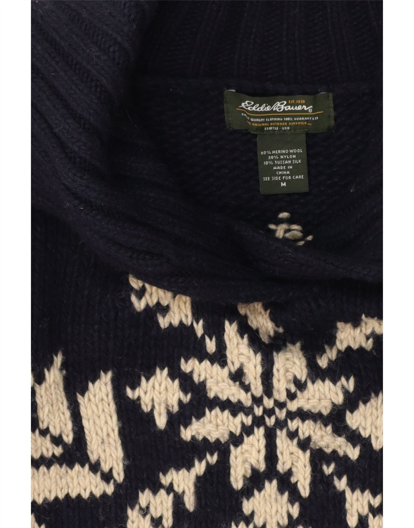 - AI Description: This pre-owned Eddie Bauer knit sweater, in excellent condition, offers a cosy and stylish option for cooler weather. Crafted from a luxurious blend of merino wool, nylon, and cashmere silk, it features a classic fit and a timeless Fair Isle pattern. The navy blue jumper boasts long sleeves, a collared neckline, and a pullover closure. A subtle snowflake design and button accents add a touch of festive charm. Size M. Washing instructions: see side for care. Made in China.