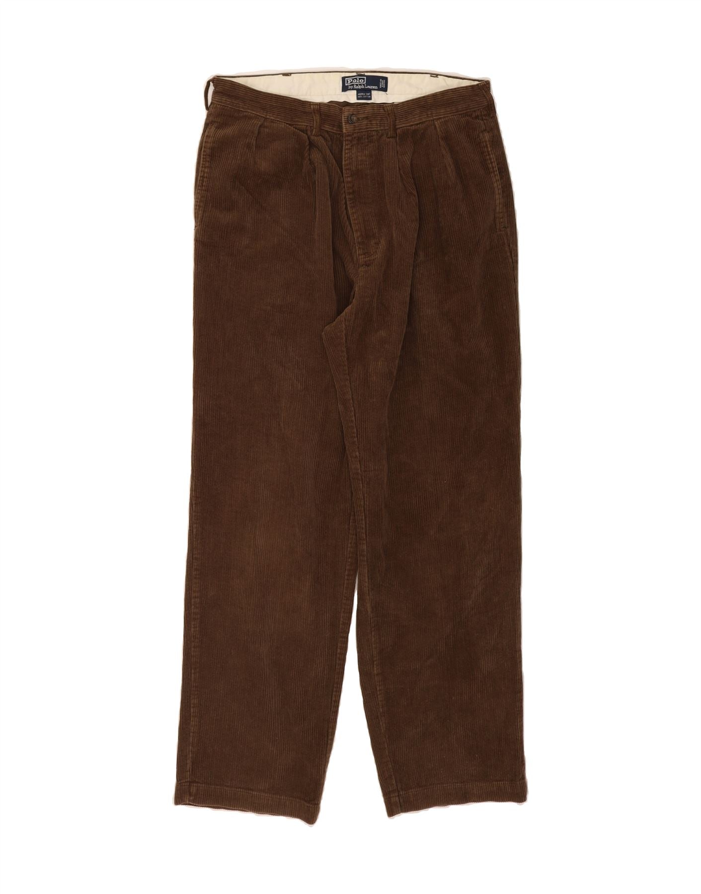 - AI Description: Elevate your wardrobe with these pre-owned Polo Ralph Lauren corduroy trousers. Crafted from 100% cotton in a versatile brown hue, these trousers offer a comfortable regular fit. The classic corduroy fabric and preppy style make them ideal for smart-casual occasions. Featuring a button closure and multiple pockets, these trousers also boast logo and buckle accents. Size 33/34. Made in Sri Lanka.