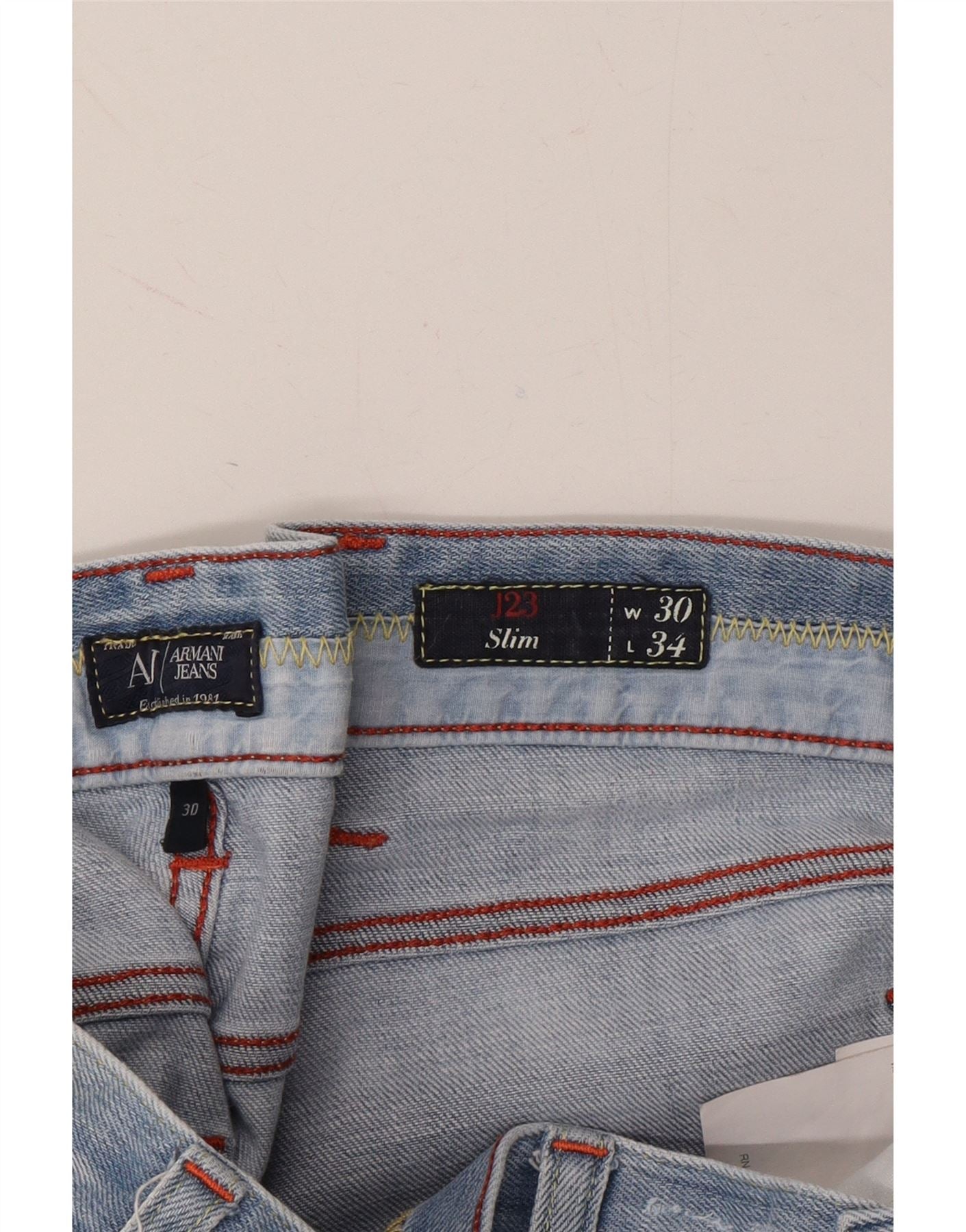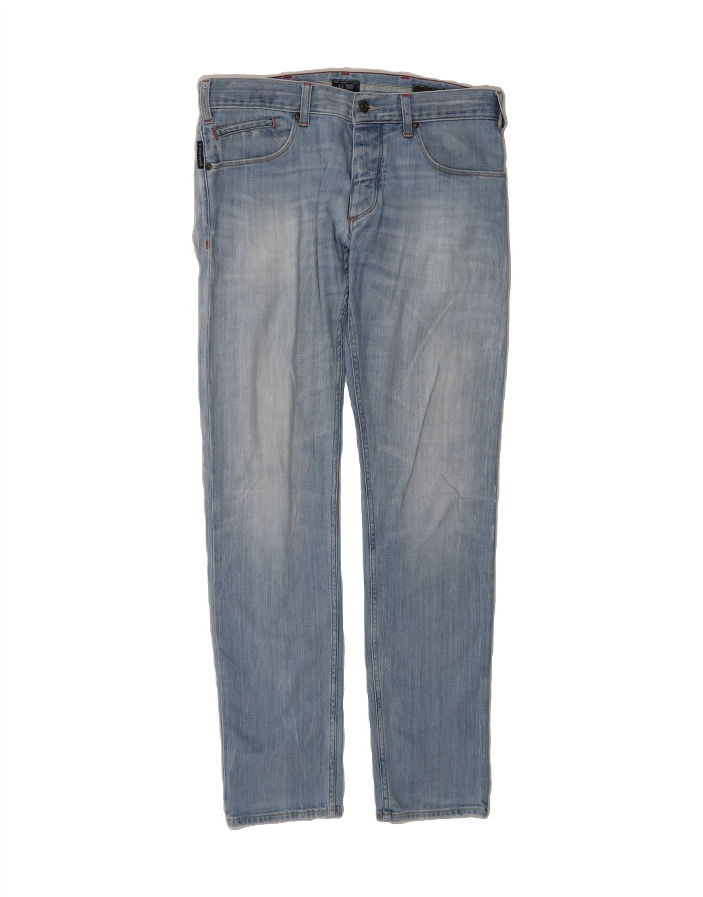 - AI Description: Elevate your denim collection with these classic slim-fit jeans from Armani Jeans. Crafted from durable denim, these jeans feature a secure button closure and practical pockets. The timeless blue wash ensures versatility, while the slim silhouette offers a flattering fit. In excellent pre-owned condition, these size 30 jeans are a stylish and sustainable choice.