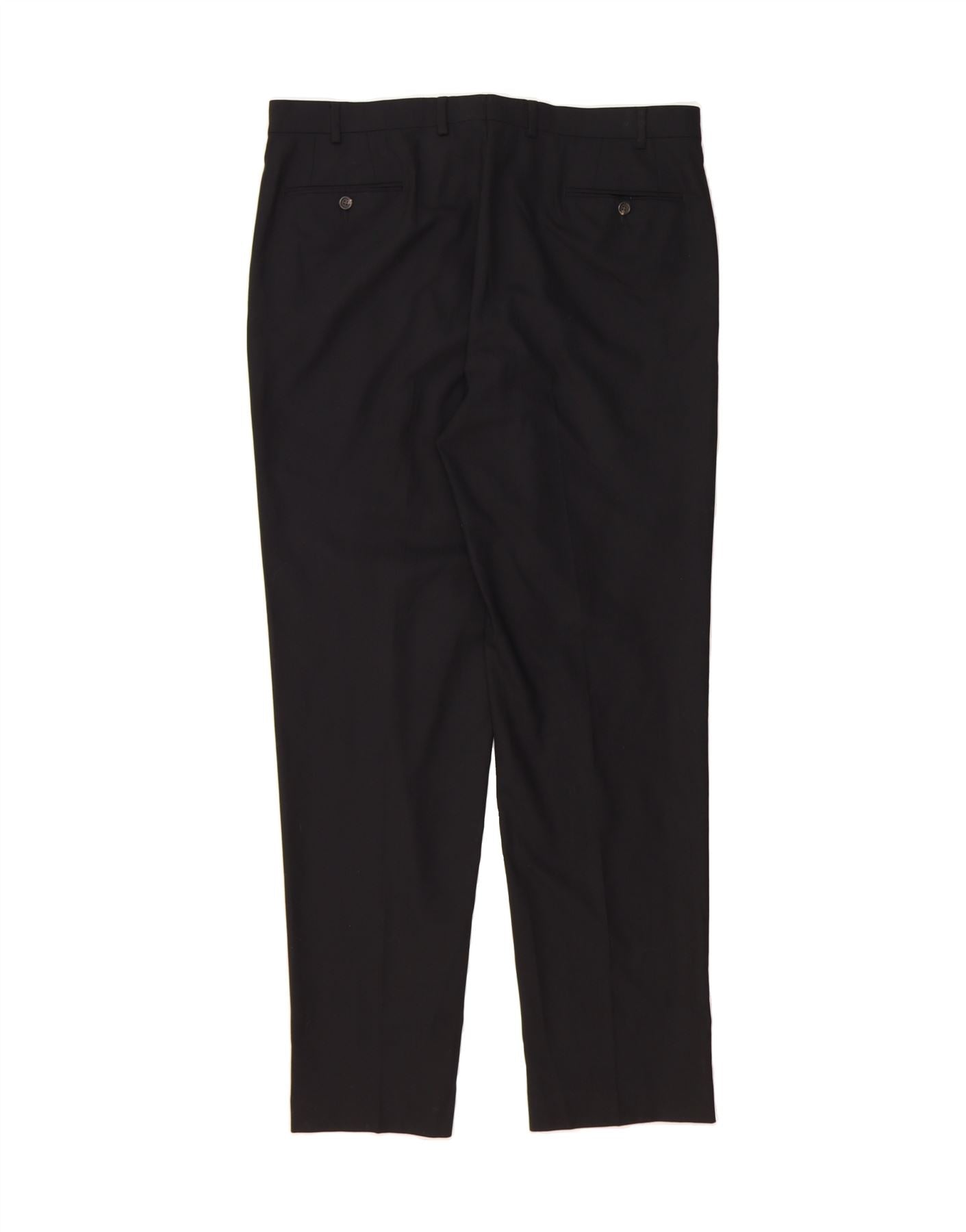 - AI Description: These Chaps trousers are a timeless wardrobe staple for any gentleman. Crafted from a quality woven wool blend (52% Wool, 45% Polyester, 3% Spandex) they offer both comfort and durability with a regular fit and button closure. The classic black colour makes them versatile for any occasion, and practical features such as pockets and stretch fabric add to their appeal. Accented with a button, these pre-owned trousers are in excellent condition and ready to wear. Label size W30 x L34. Dry clean only.