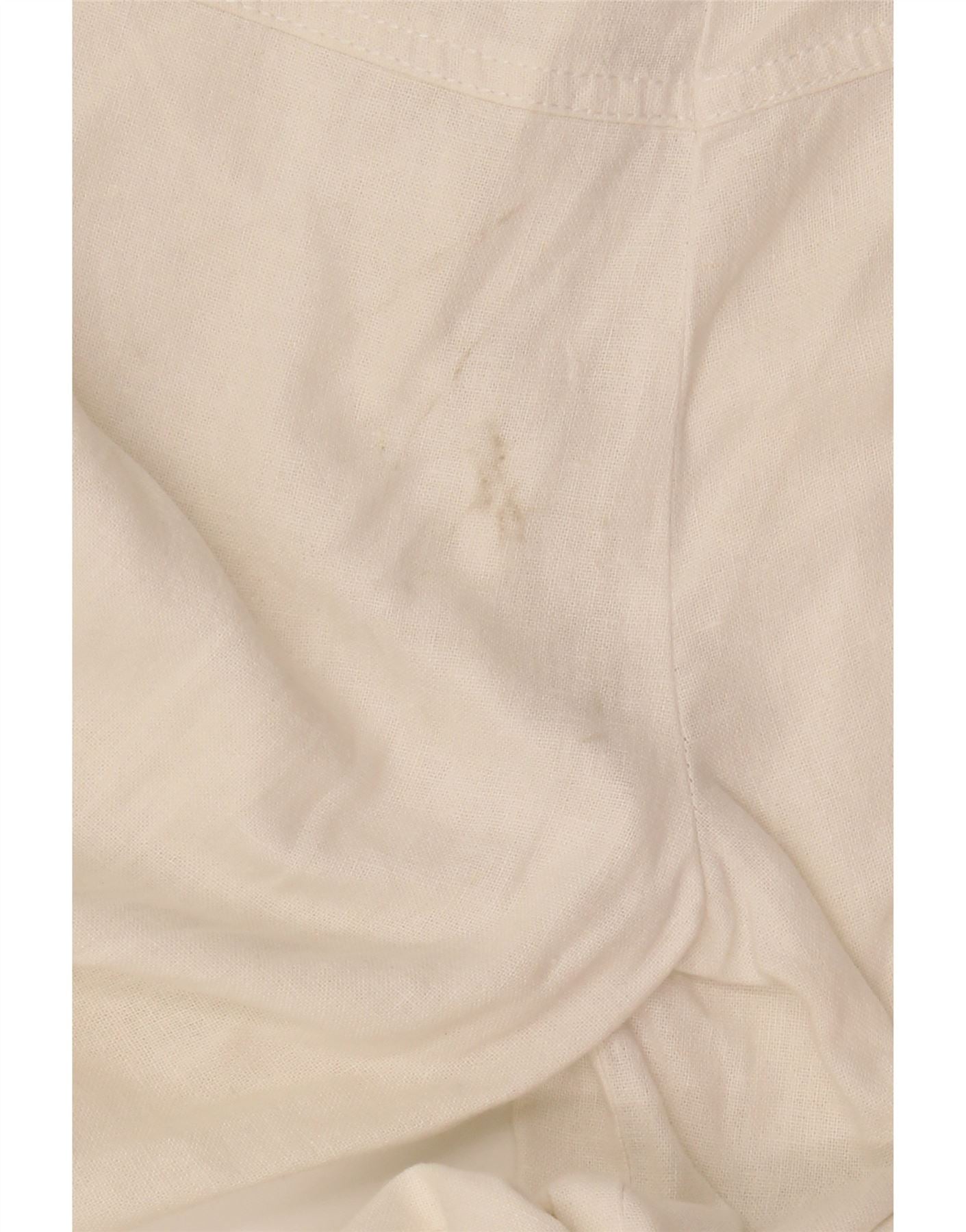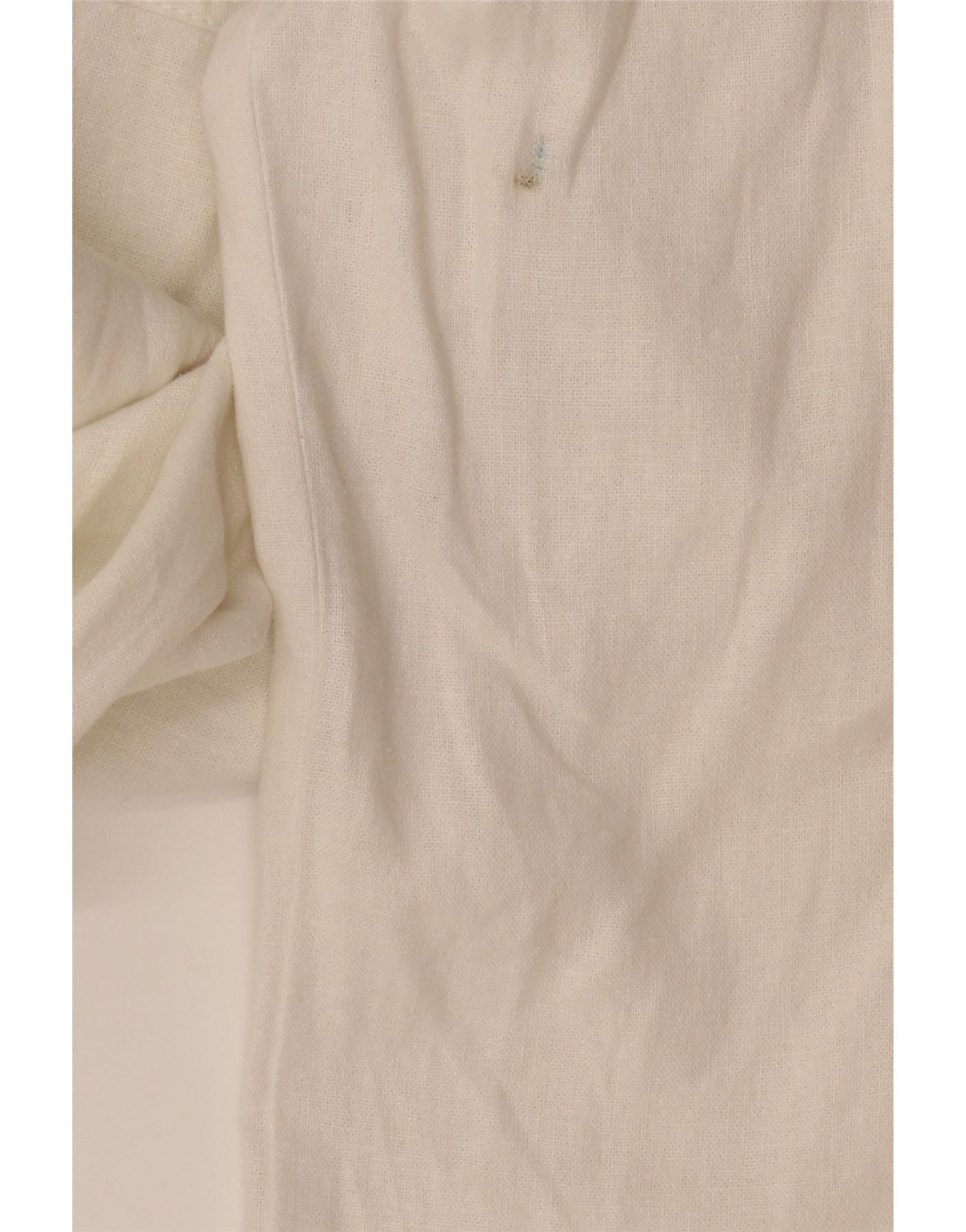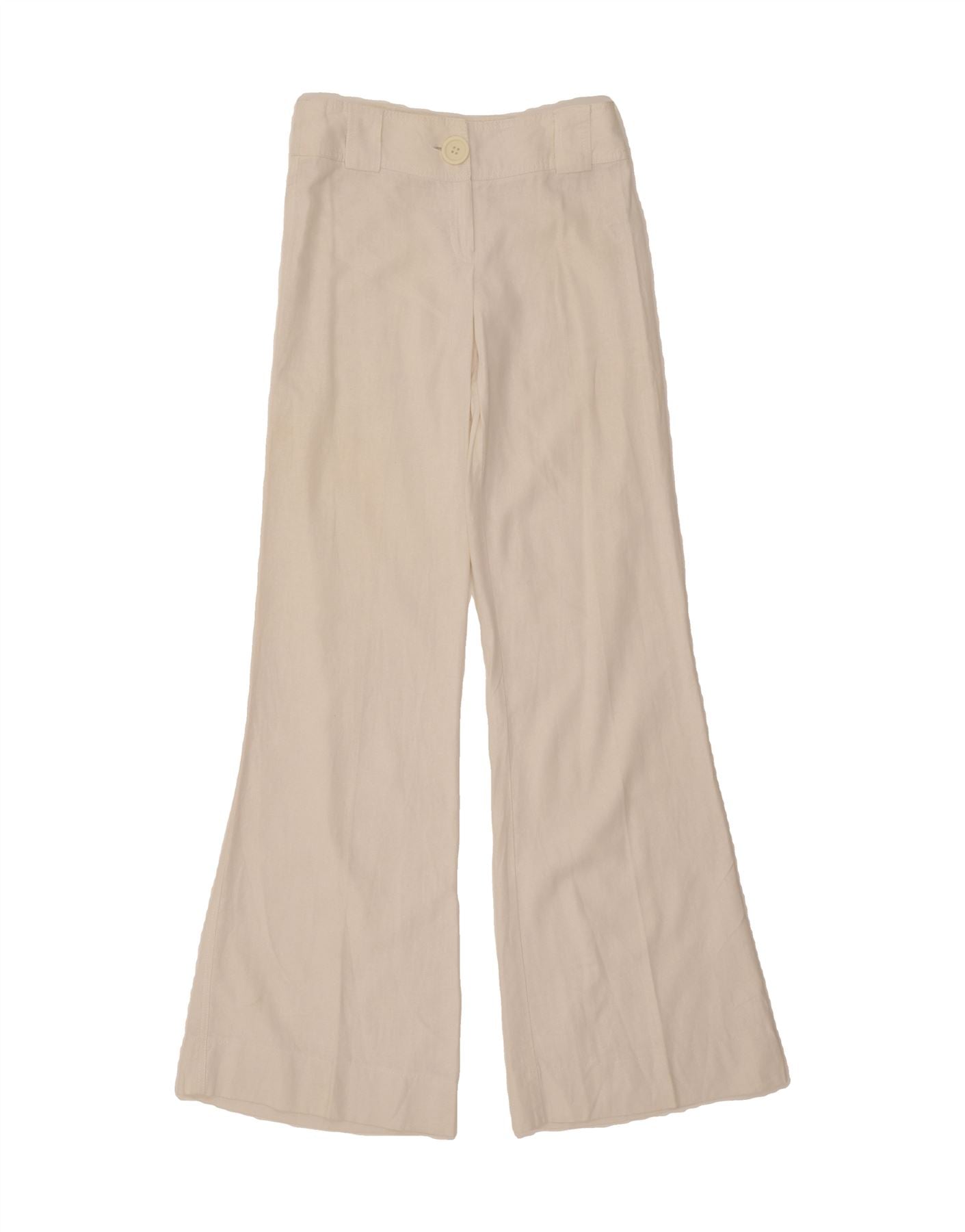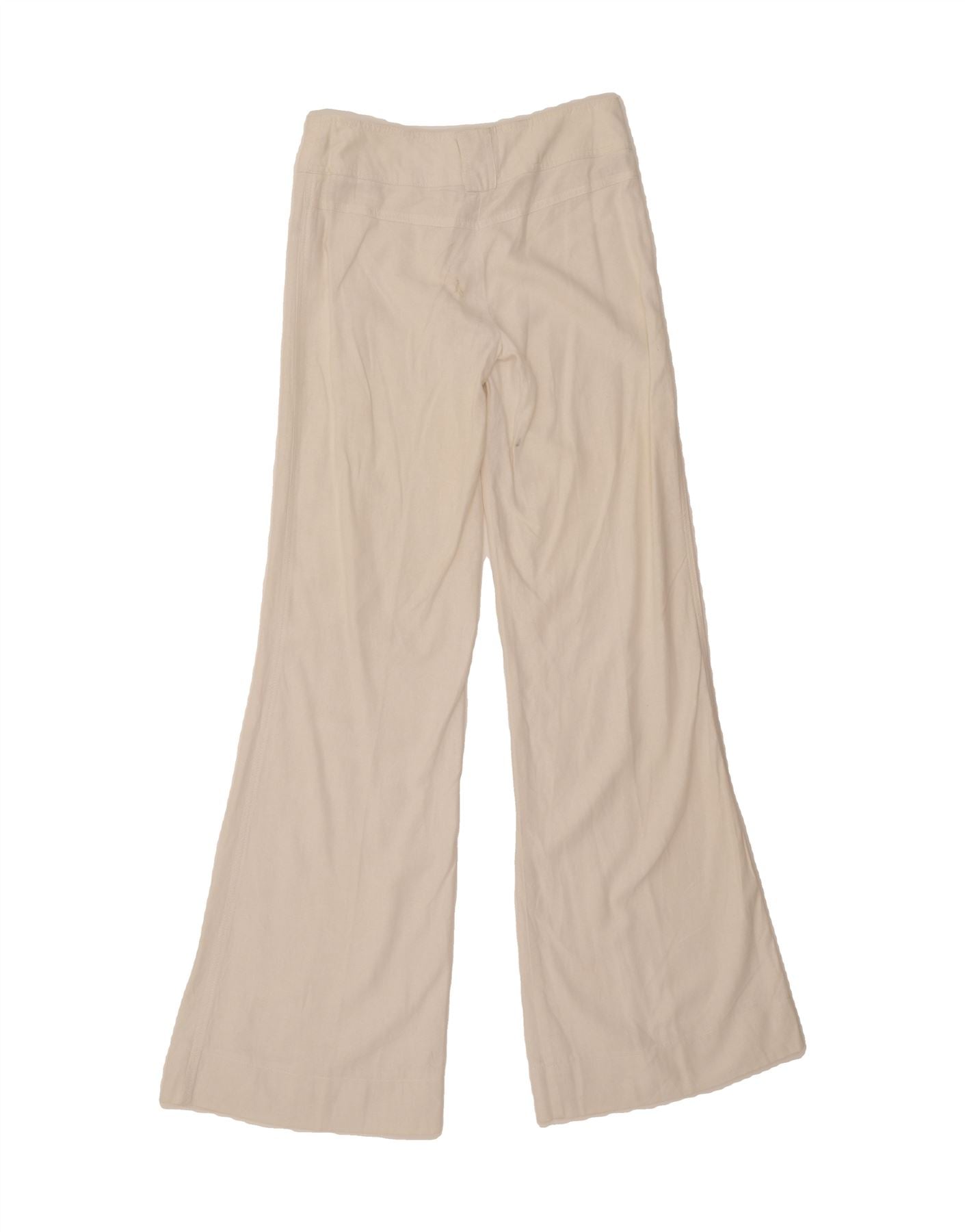 - AI Description: Topshop classic trousers in off-white linen blend (55% viscose, 45% linen). Size 8. Features a button closure, wide leg, regular fit, and pockets. Pre-owned in fair condition with moderate stains on the front near the crotch and minor stains on the back. Accent button. Washing instructions: Wash separately in linen wash, do not tumble dry, do not iron trim, wash inside out.