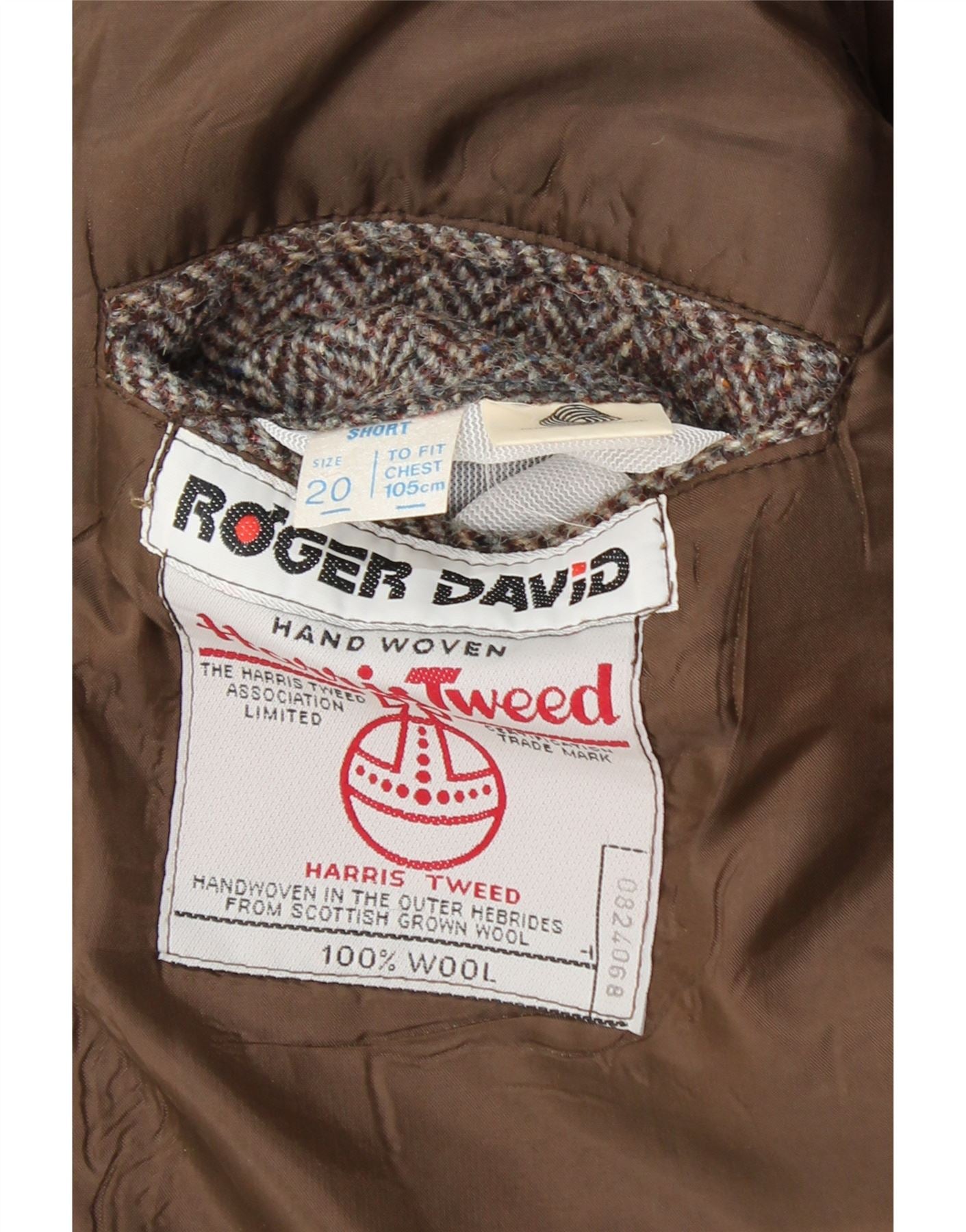 - AI Description: This vintage men's blazer jacket is crafted from 100% wool tweed in a classic herringbone pattern. The brown jacket features a regular, heritage fit with long sleeves and a collared neckline. It has a button closure, pockets, shoulder pads and is fully lined. This stylish piece is in pre-owned excellent condition. The label size is 20.