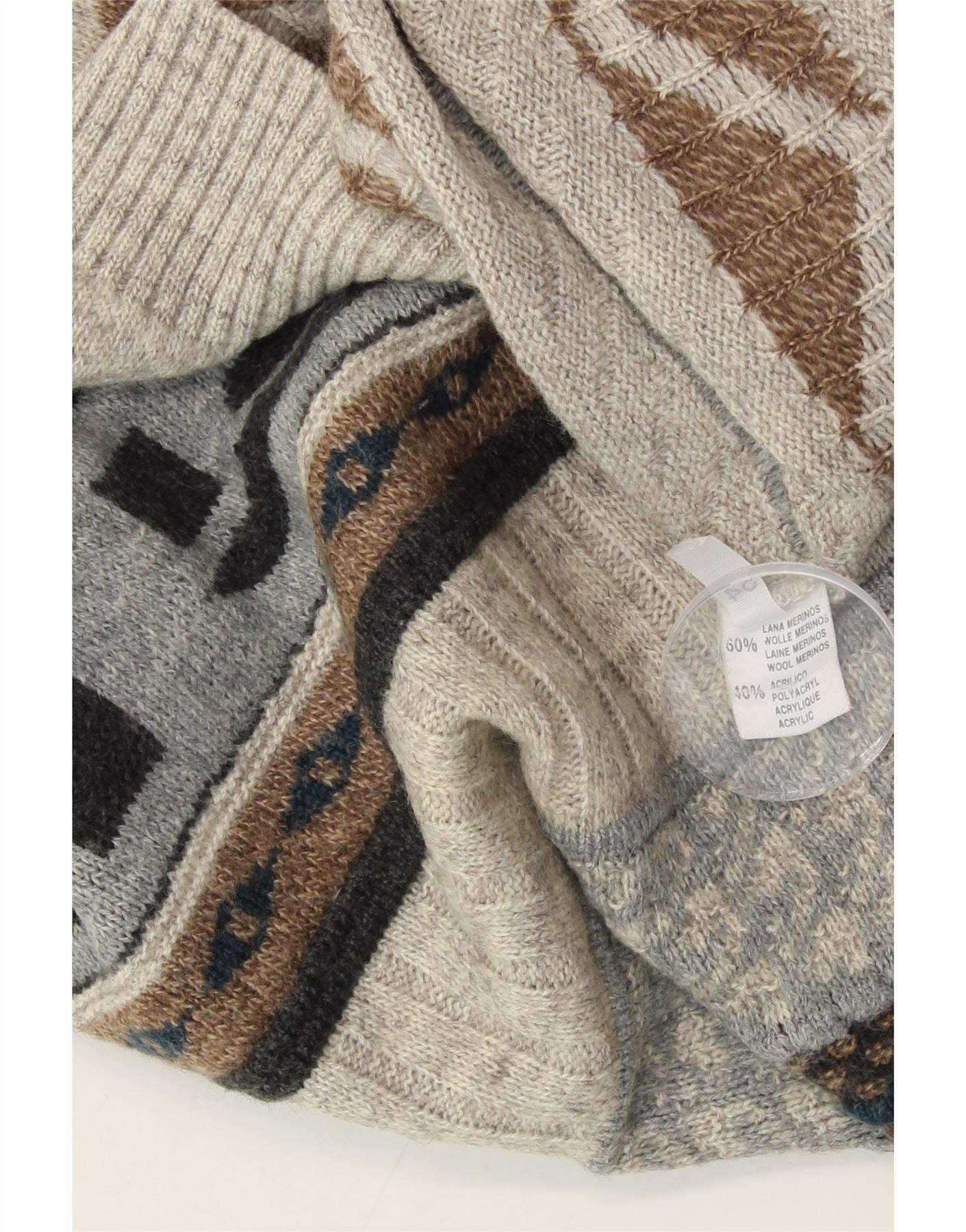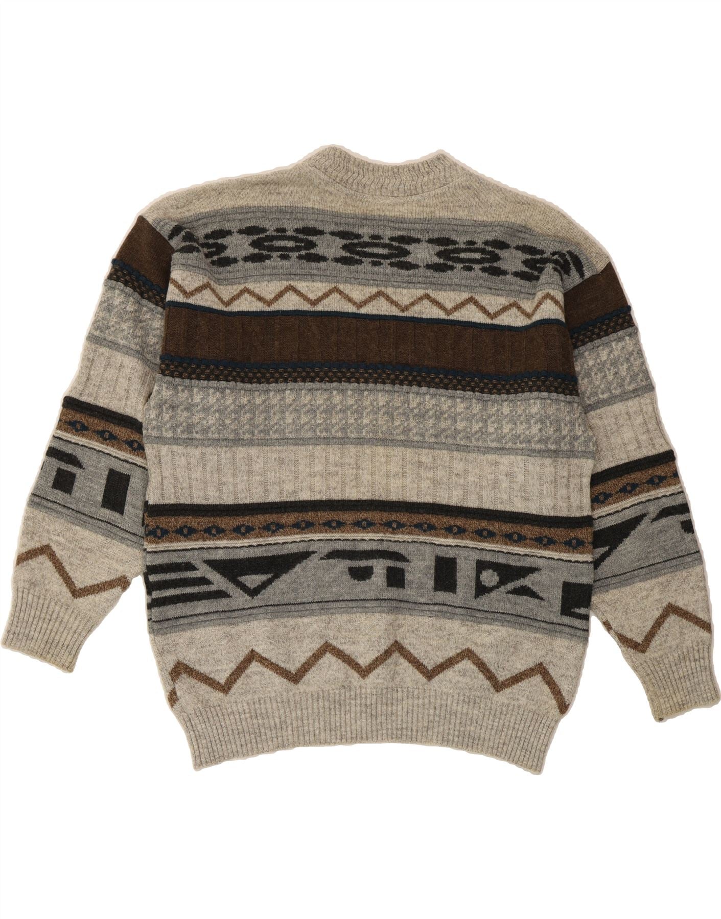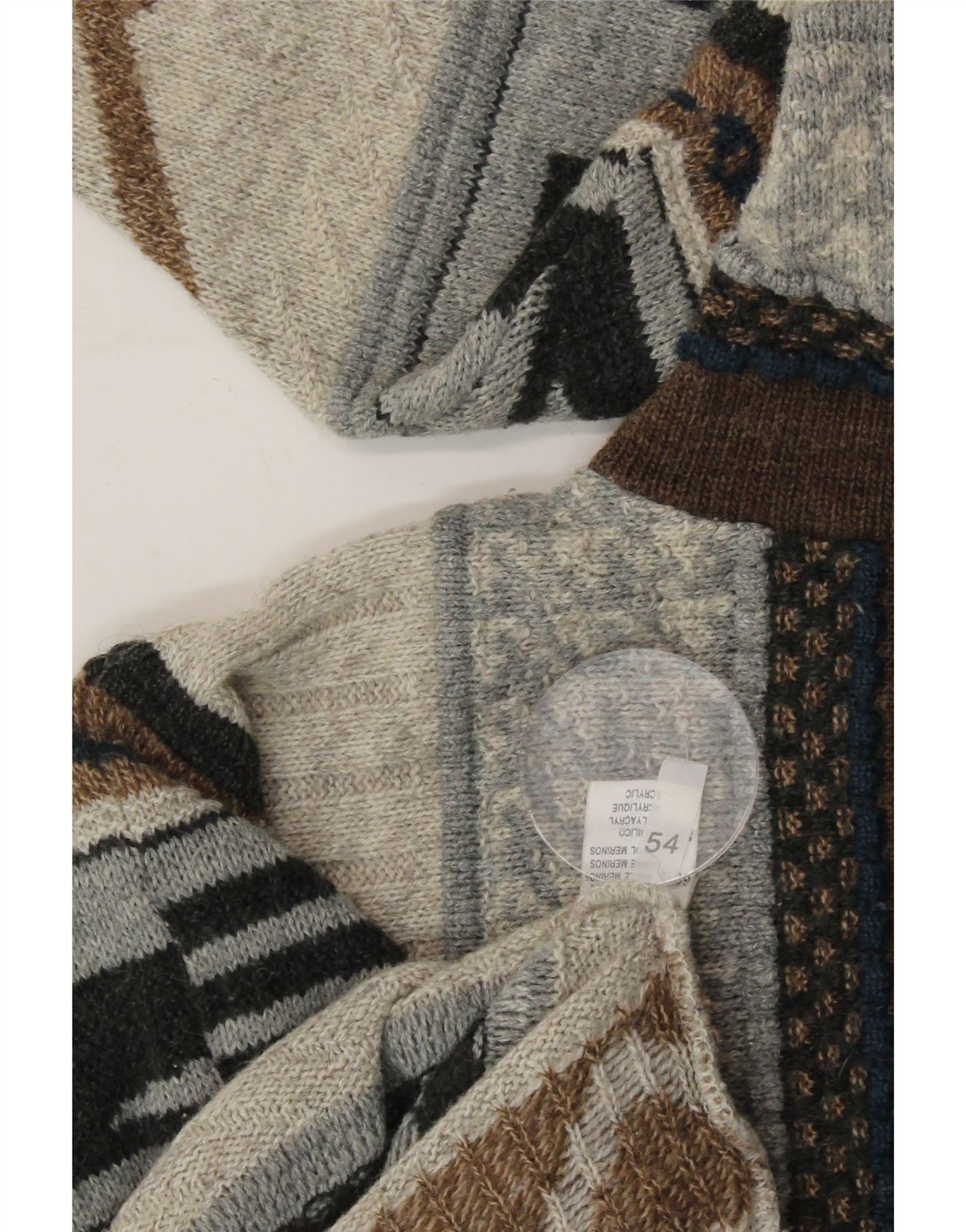 - AI Description: This vintage men's jumper offers retro style with a geometric pattern. Crafted from a knit fabric of 60% Merino wool and 40% acrylic, this grey, round-neck sweater features long sleeves and a regular fit. The pullover closure ensures ease of wear. Although pre-owned, it's in excellent condition. Accented with a button, this size 54 jumper is a unique addition to any wardrobe.