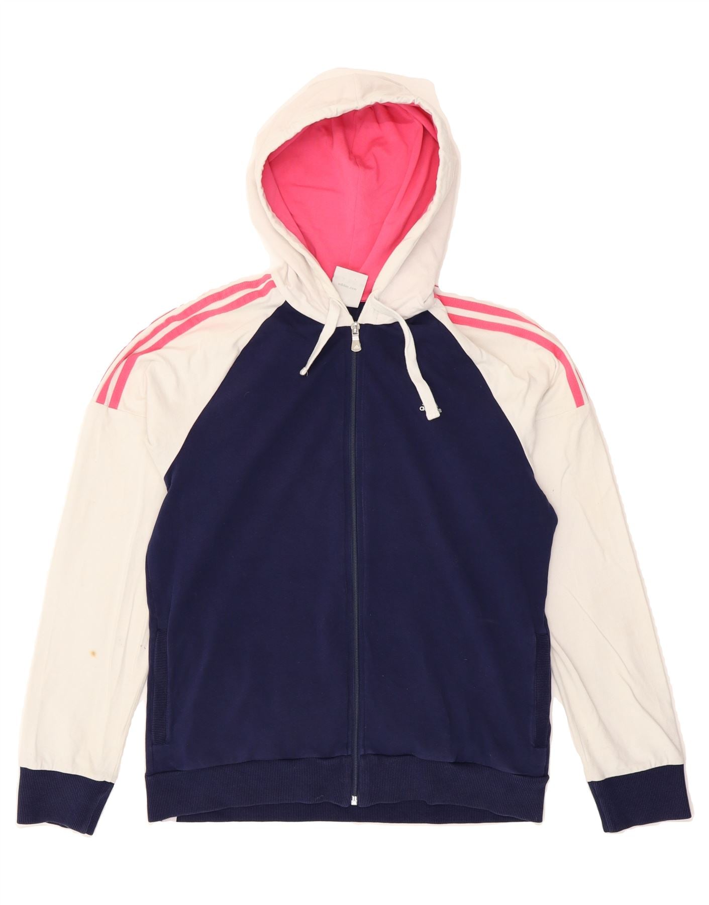 ADIDAS Womens Zip Hoodie Sweater UK 16 Large Navy Blue Colourblock Cotton