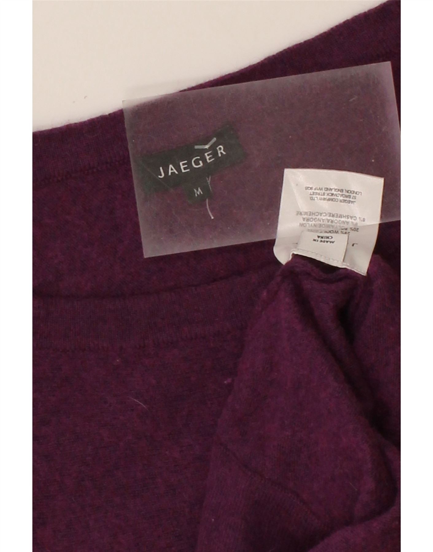 - AI Description: Elevate your knitwear collection with this pre-owned Jaeger sweater. Crafted from a luxurious blend of cashmere, angora, wool, and nylon, this purple round neck jumper offers a classic and comfortable regular fit. The short sleeves and knit fabric make it a versatile piece. Features a pullover closure and a subtle button accent. In excellent condition.