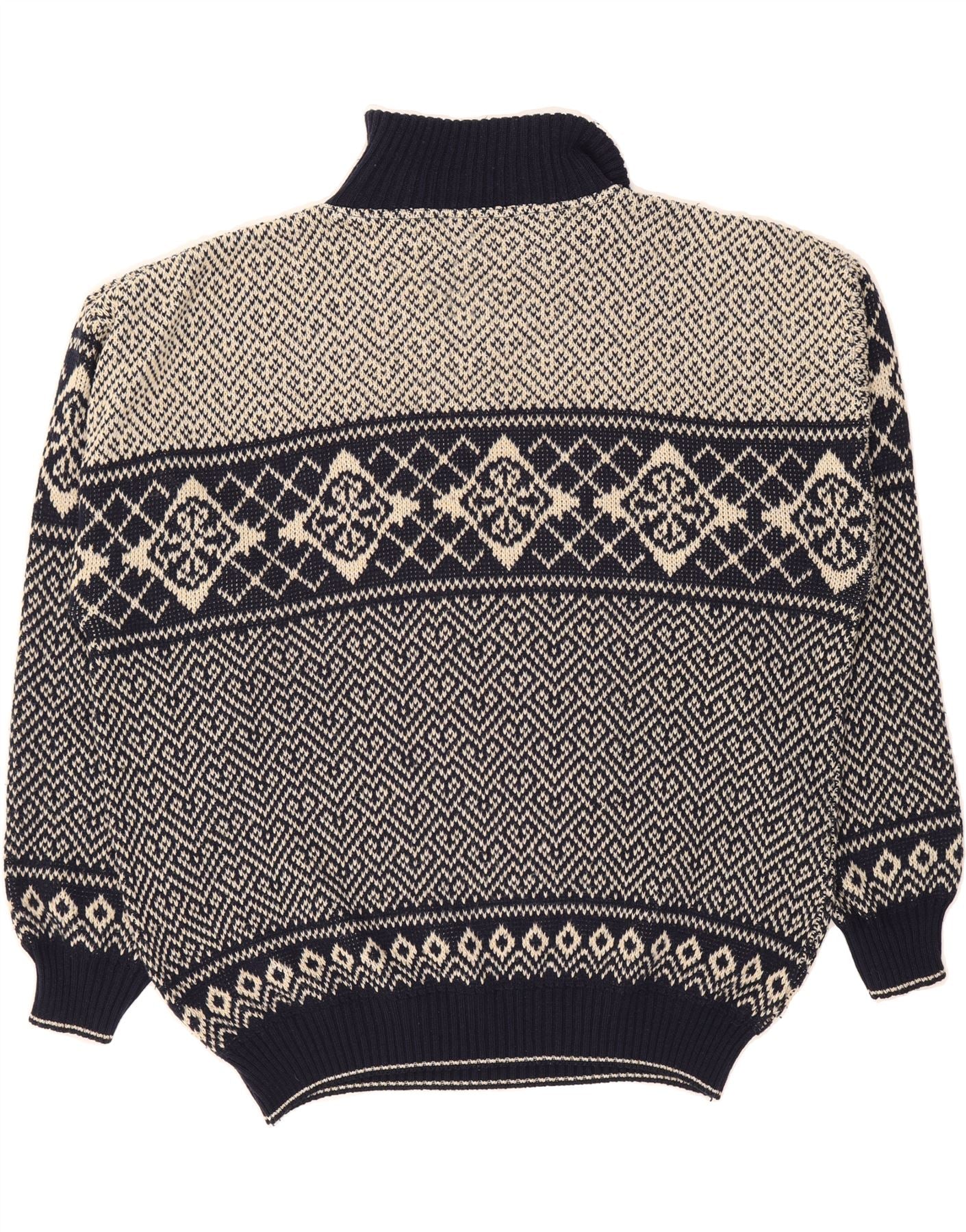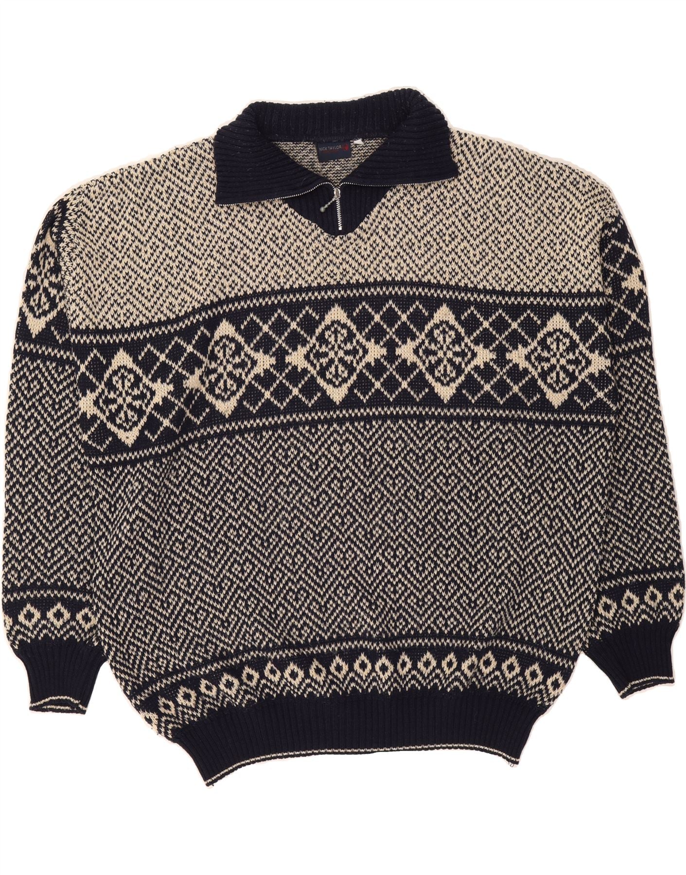 NICK TAYLOR Mens Zip Neck Jumper Sweater 2XL Navy Blue Fair Isle Acrylic
