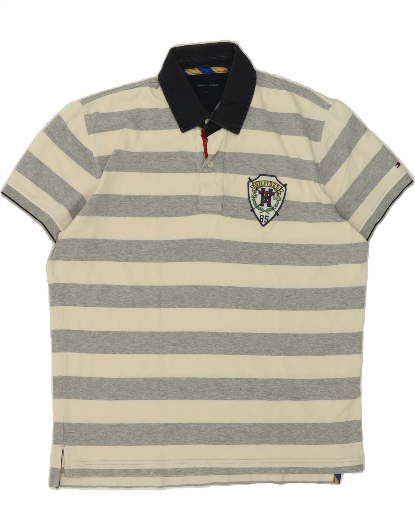 TOMMY HILFIGER Mens Polo Shirt Large Beige Striped Cotton