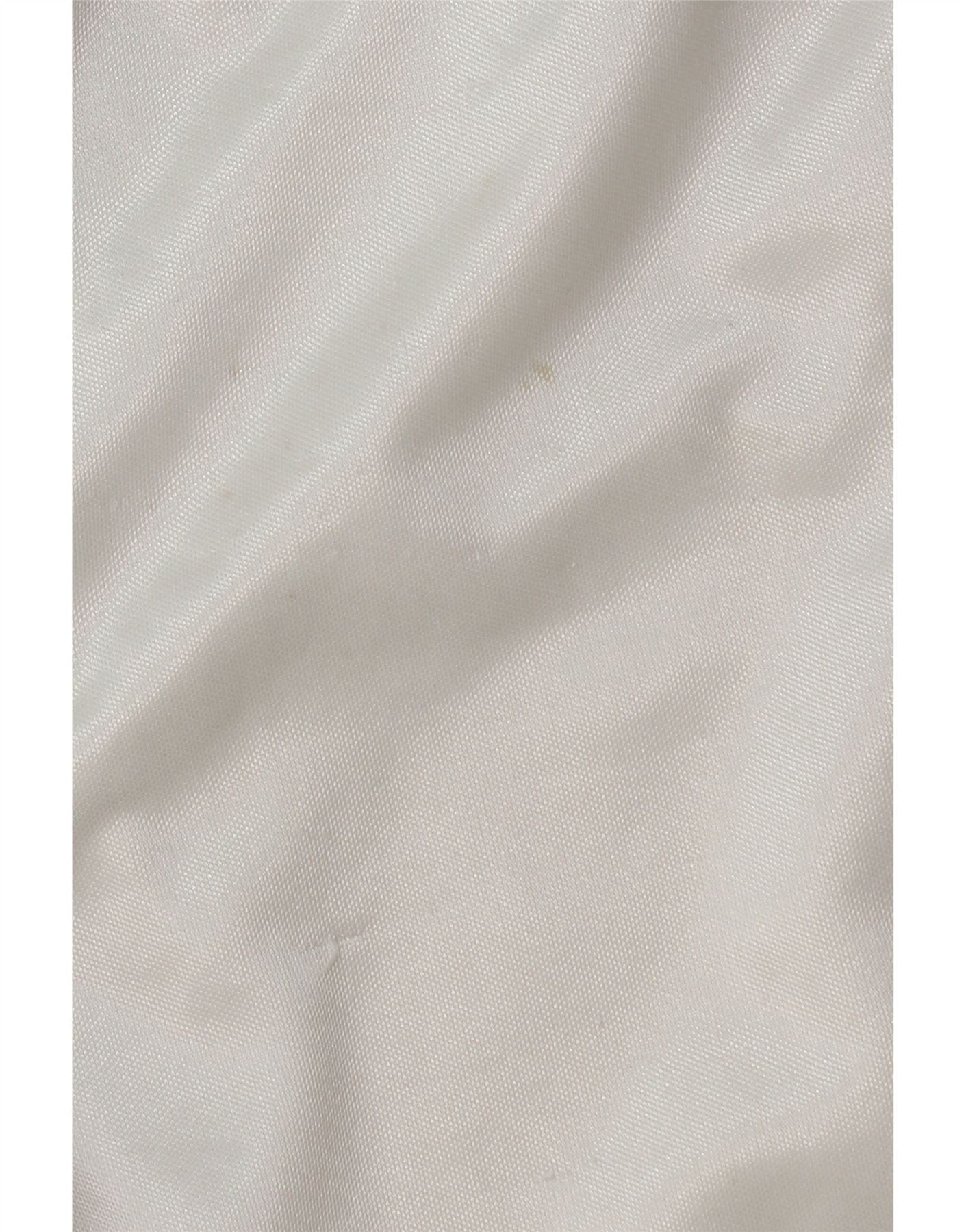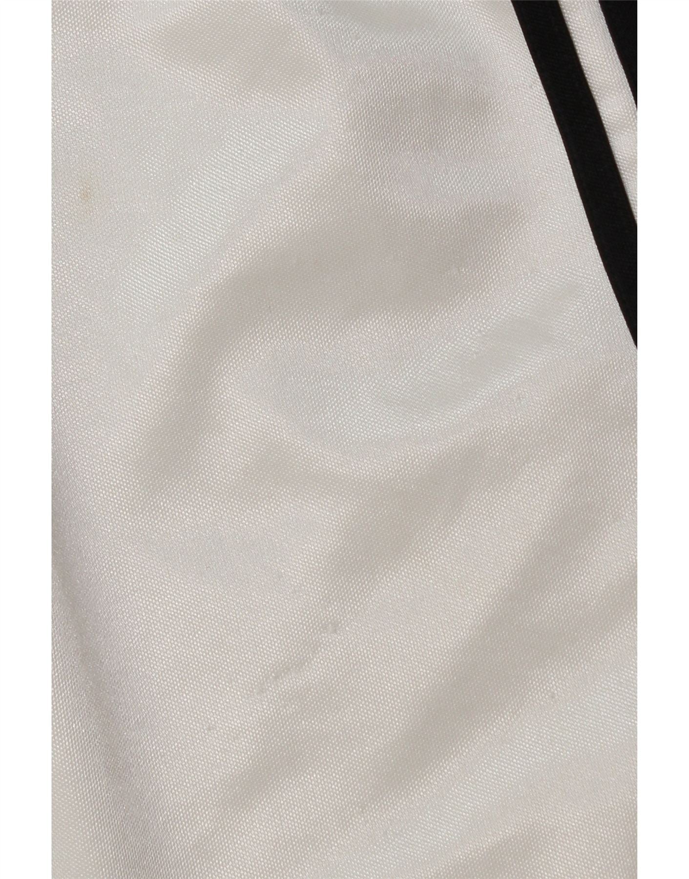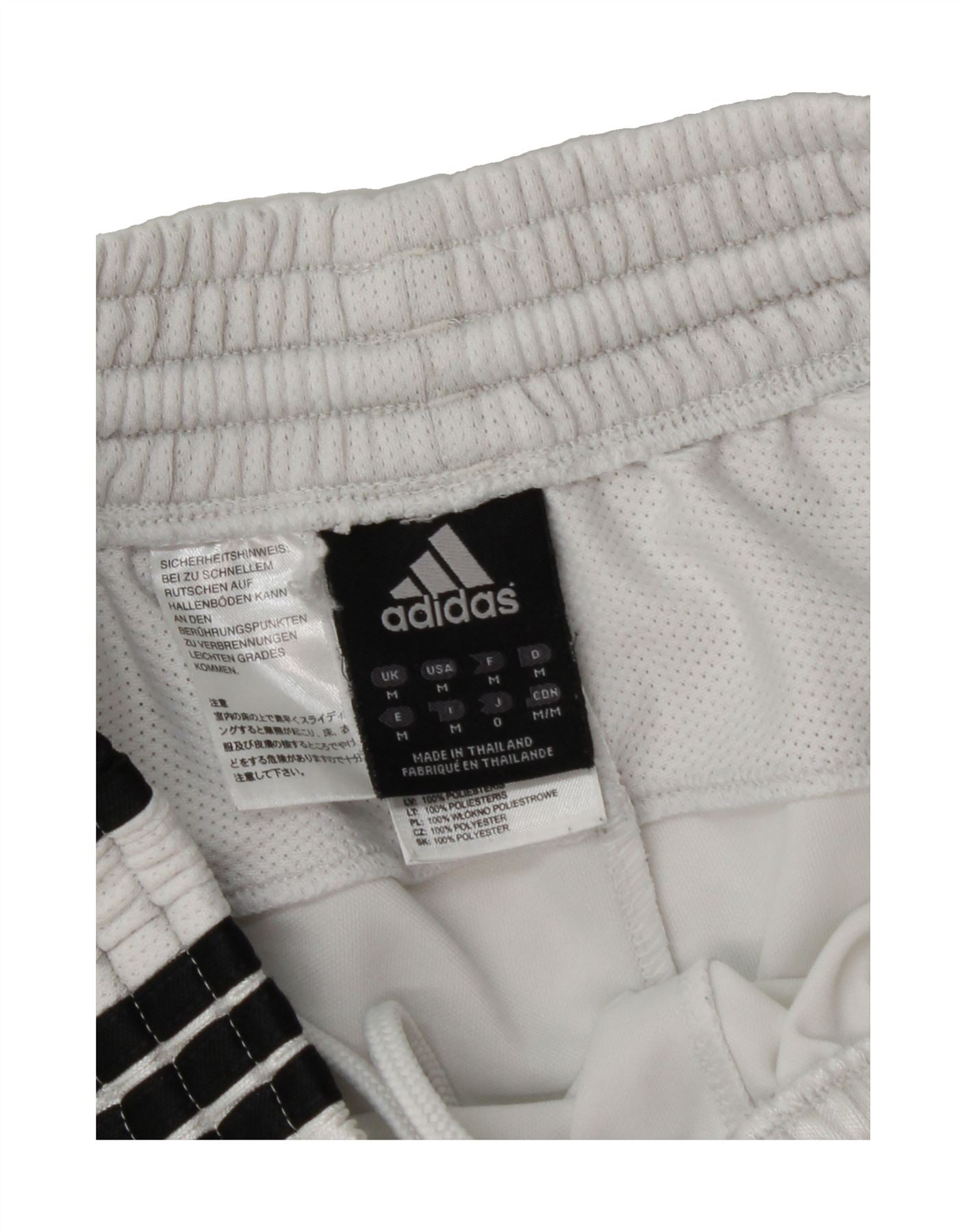 - AI Description: Adidas sports shorts for men, crafted from 100% polyester in white with a striped pattern. These pre-owned shorts, size M, feature a comfortable athletic fit with an elastic waist and drawstring closure. The design is accented by the Adidas logo. Garment is in excellent condition, however, there are some minor defects: loose stitching on the waistband and label, and some minor stains on the front.