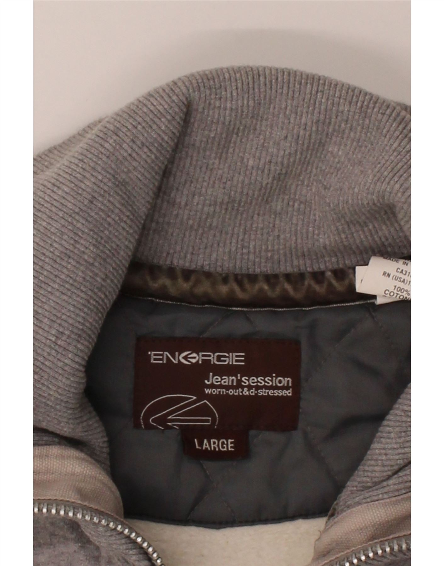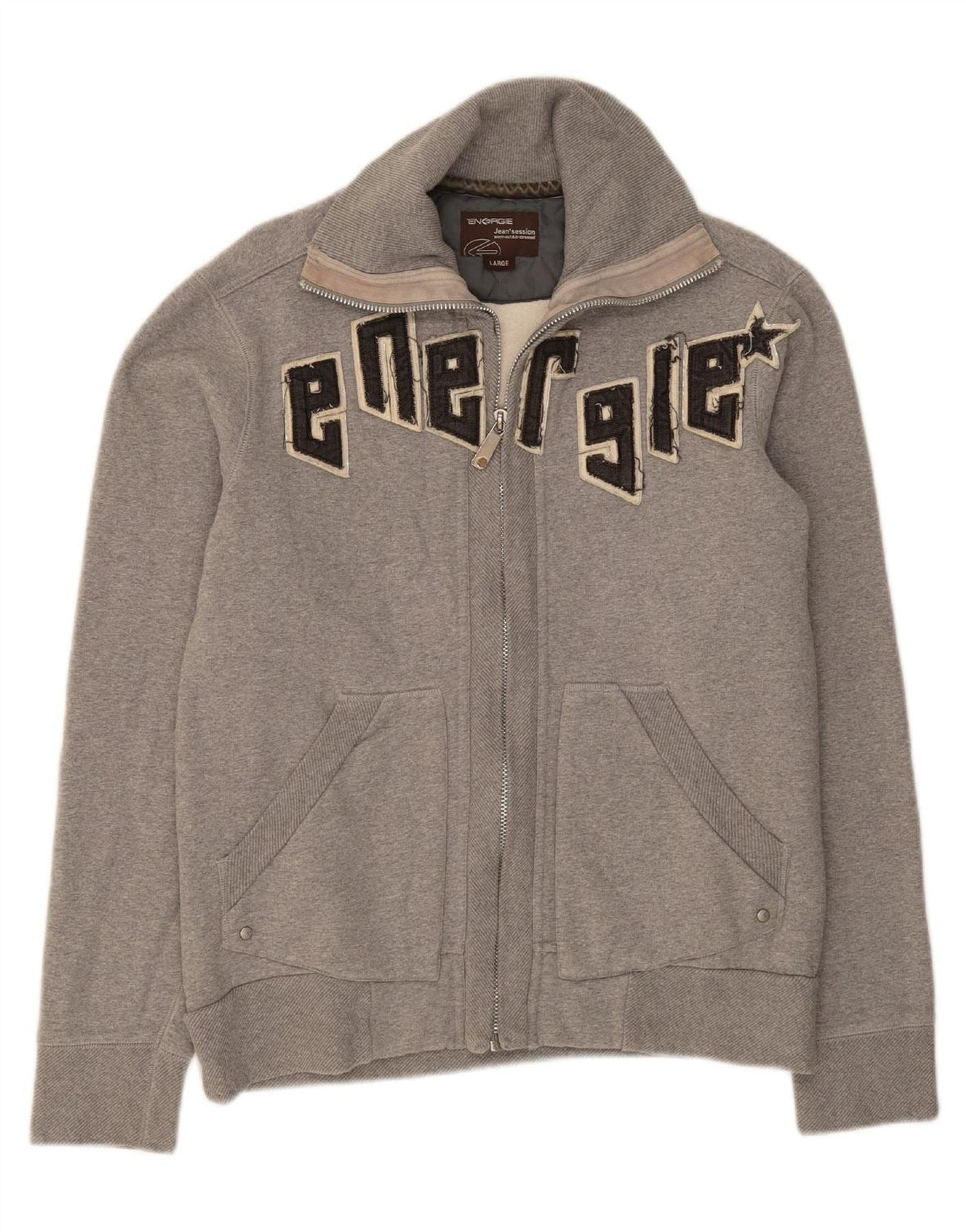 - AI Description: This Energie mens sweatshirt jumper is crafted from soft grey 100 percent cotton knit. It features a collared neckline with a practical full zip closure. Long sleeves and a regular fit offer comfortable wear. The design includes convenient pockets. An embroidered spell-out accent provides a subtle retro detail.