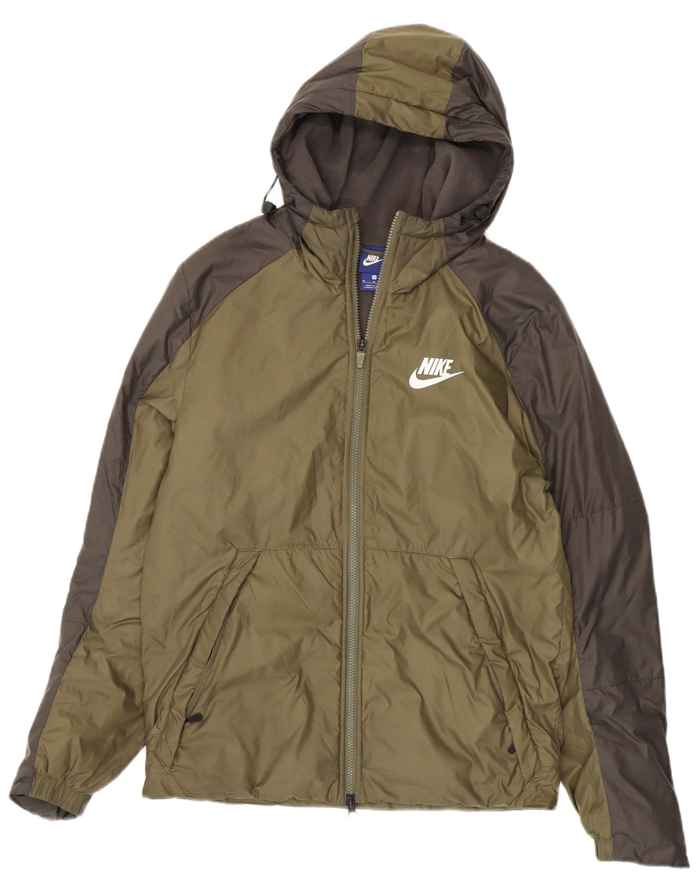 - AI Description: This Nike mens padded jacket is crafted from lightweight green polyester with a woven finish. It features a practical hooded design and a full zip closure for versatile wear. Long sleeves and a regular fit ensure comfortable movement. Zipped pockets offer secure storage, while a subtle logo provides signature branding. This jacket is ideal for active outdoor pursuits.