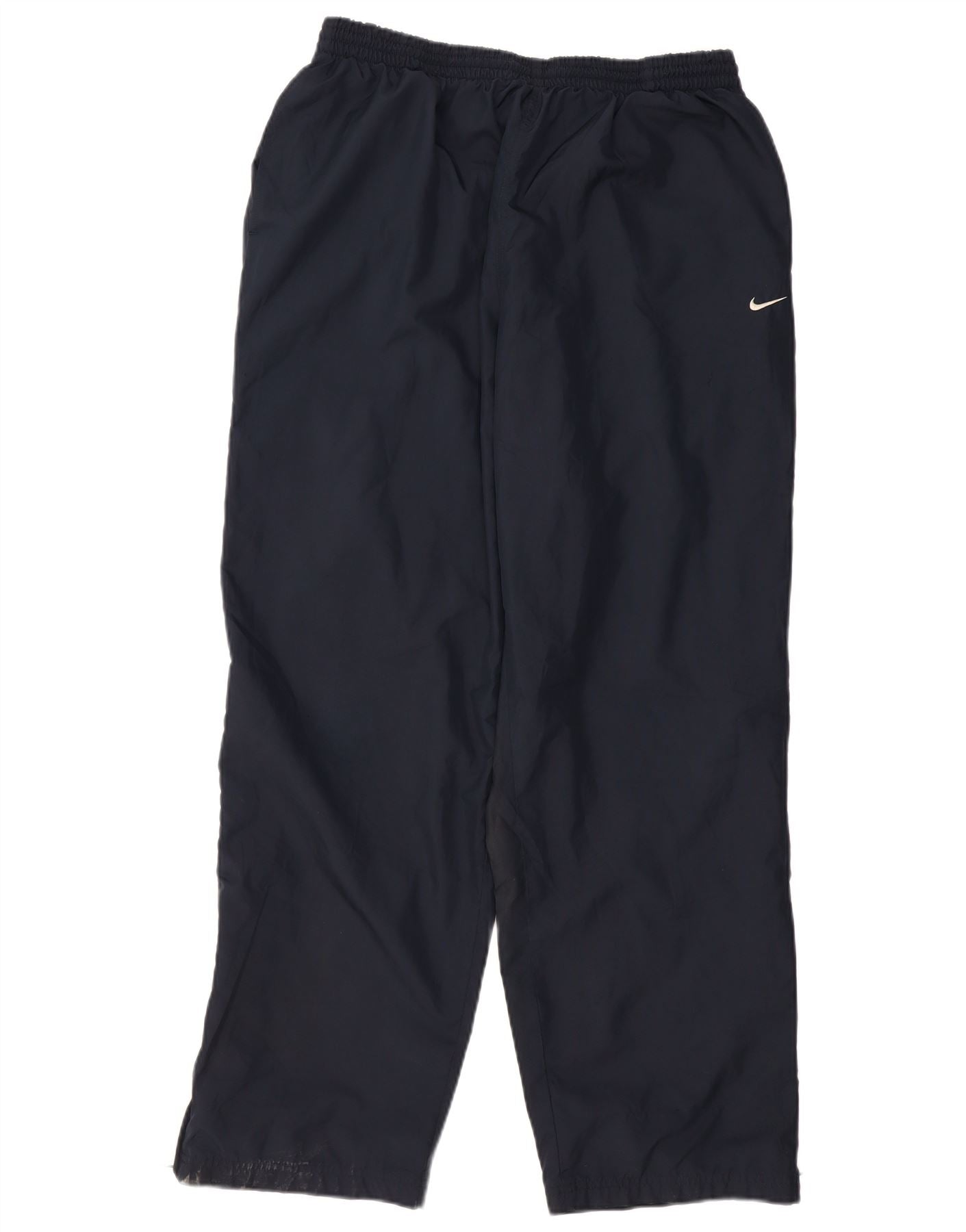 - AI Description: This Nike mens tracksuit trousers are crafted from lightweight navy blue polyester woven fabric. They offer a regular fit for comfortable movement. The pull on design features an adjustable drawstring waist for a secure feel. Side pockets provide practical storage. These trousers are windproof and breathable, making them ideal for sports. A subtle Nike logo adds a signature athletic touch.