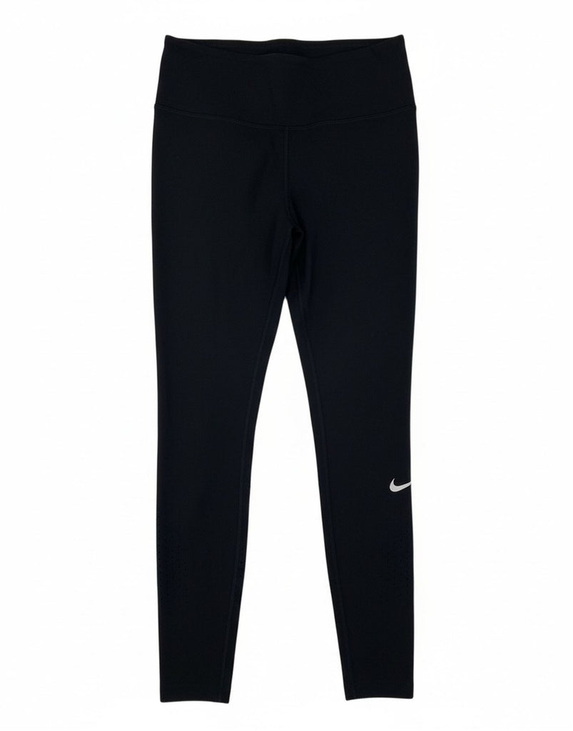 - AI Description: These Nike womens Dri-Fit leggings are crafted from a smooth black polyester elastane blend. The blended fabric offers exceptional stretch and breathability, ideal for performance. A pull-on design with an elastic waist ensures a secure, comfortable fit. They feature a sleek, athletic slim fit, designed to move with the body. Practical pockets are included, and a subtle logo accent provides signature Nike detailing, perfect for running.
