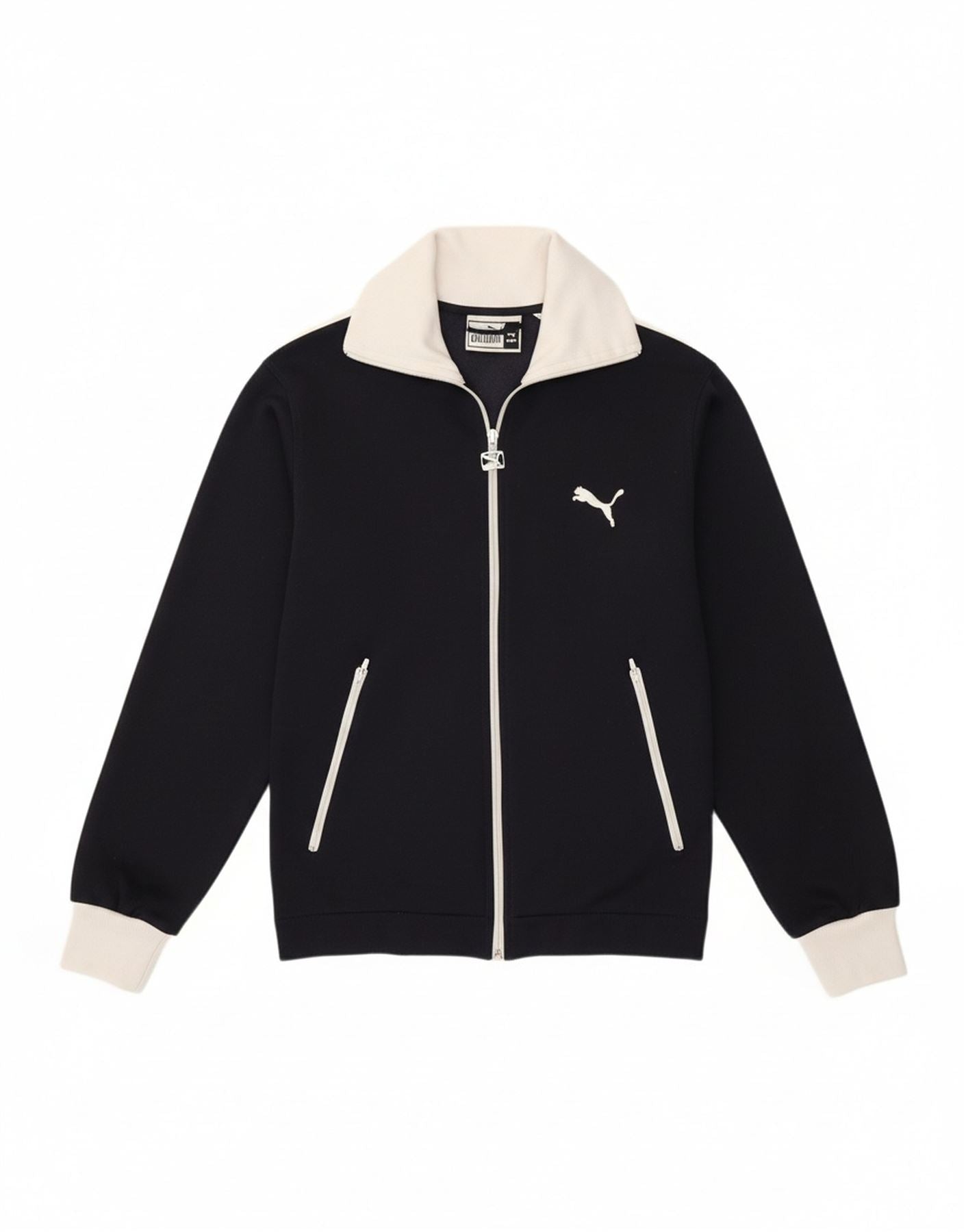 - AI Description: This Puma womens tracksuit top jacket is crafted from a comfortable navy blue polyester cotton blend knit fabric. Its stretch ensures ease of movement. It features a collared neckline and a full zip closure for versatile styling. Long sleeves offer warmth. The regular fit provides classic comfort. Practical pockets add functionality. A signature logo provides a retro athletic accent.