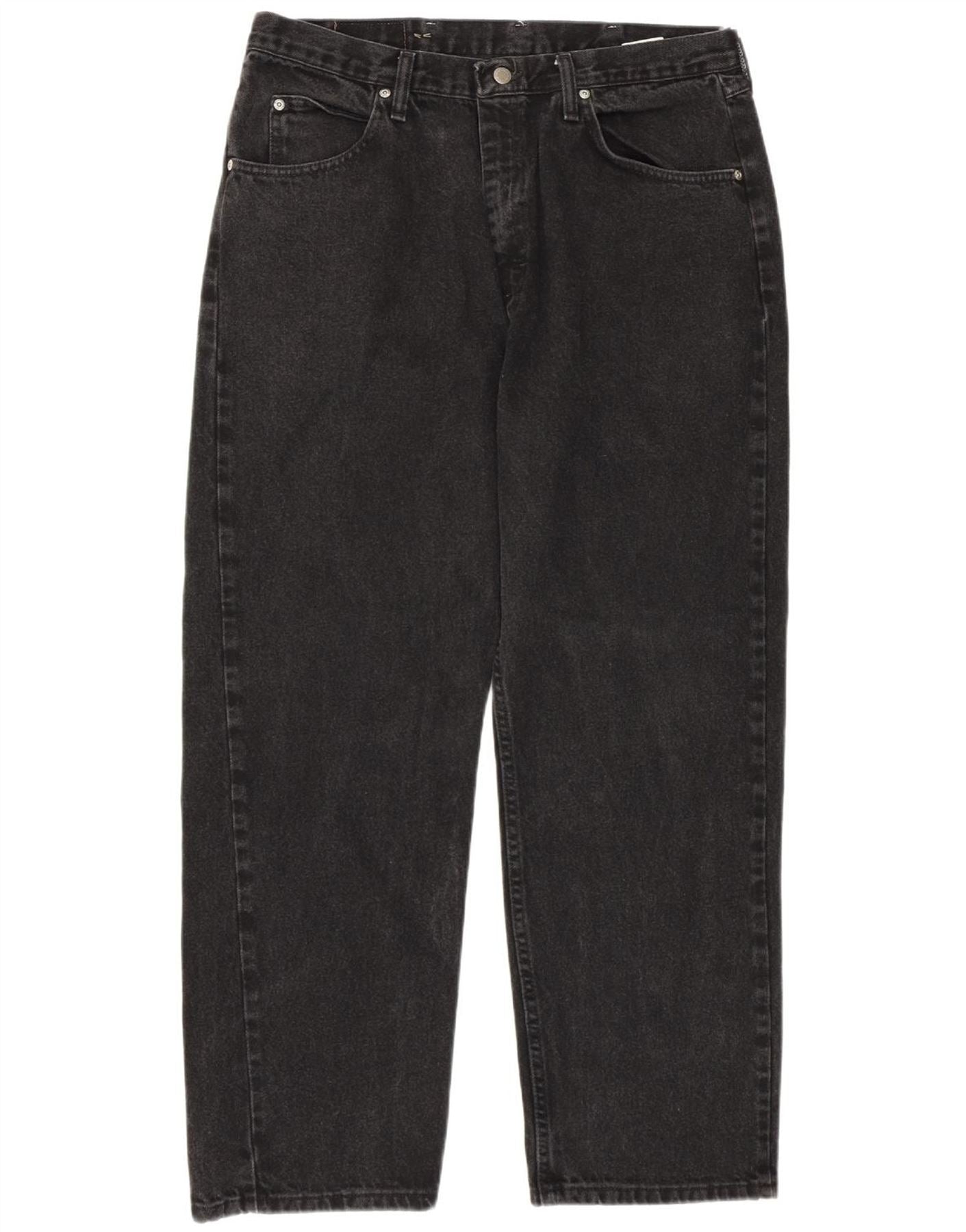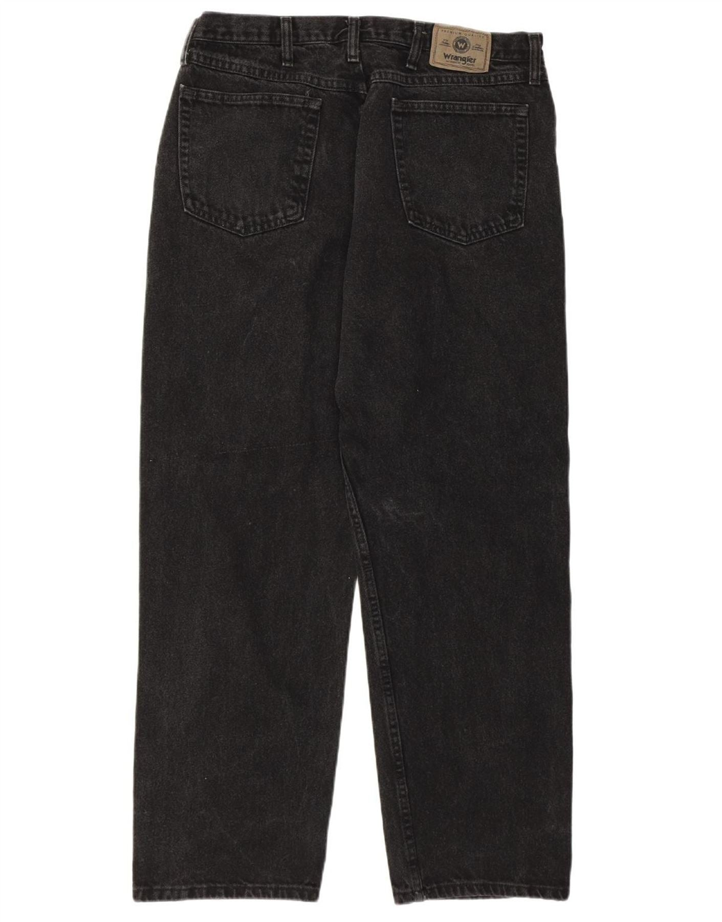 - AI Description: These Wrangler mens straight jeans are crafted from robust black denim, made from 100 percent cotton. They feature a comfortable regular fit through the leg. The classic straight cut ensures a timeless silhouette. A button closure secures the waist, and practical pockets are included. The design is clean and unpatterned, focusing on a classic, versatile style.