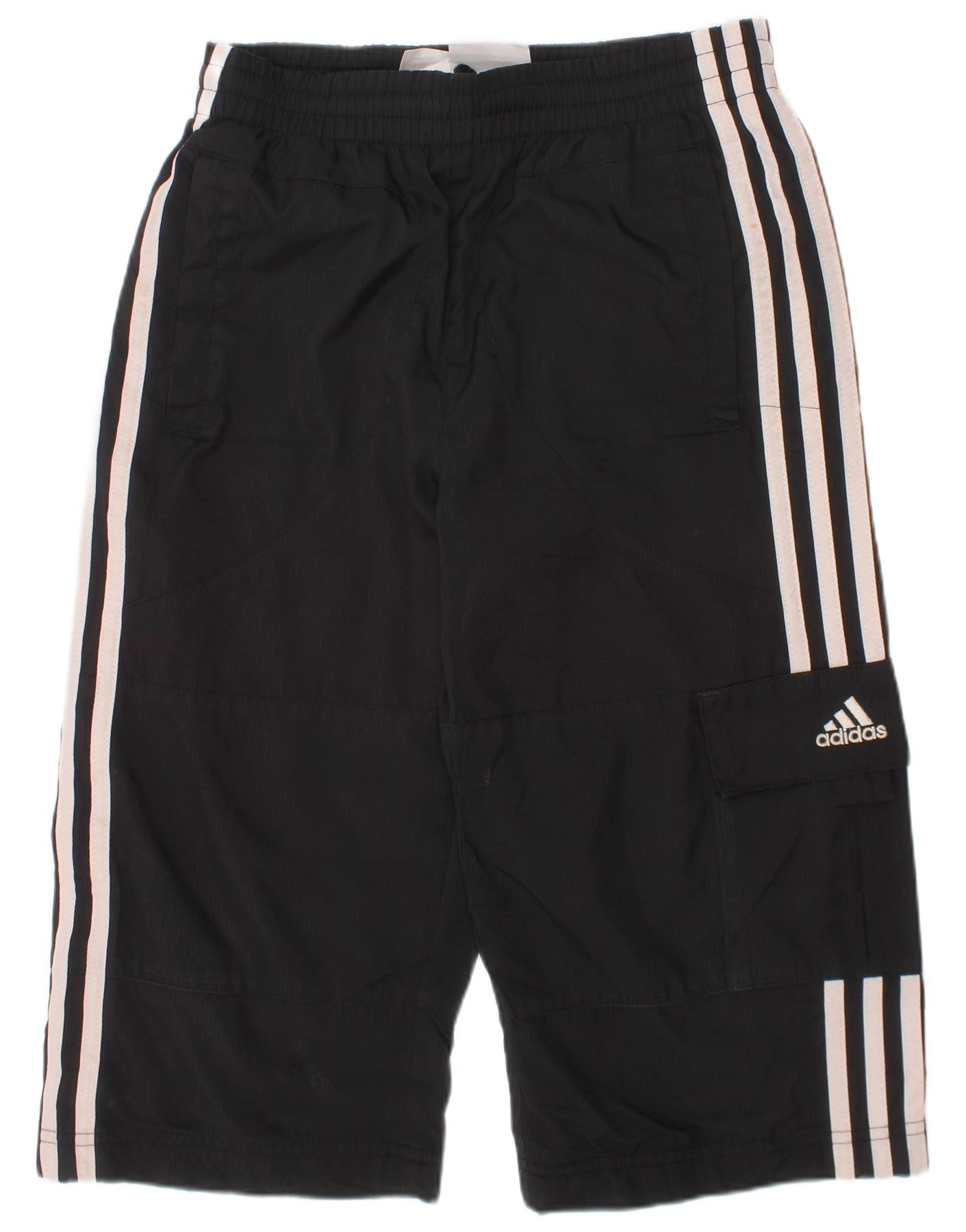 - AI Description: These Adidas boys' cargo shorts are crafted from lightweight black woven fabric. They feature a comfortable elastic waist and a pull-on design. The regular fit ensures ease of movement. Classic white three stripes run down each side. A practical cargo pocket on the leg includes the Adidas logo. Side pockets add functionality. Ideal for sports or casual wear, these shorts offer both style and comfort.