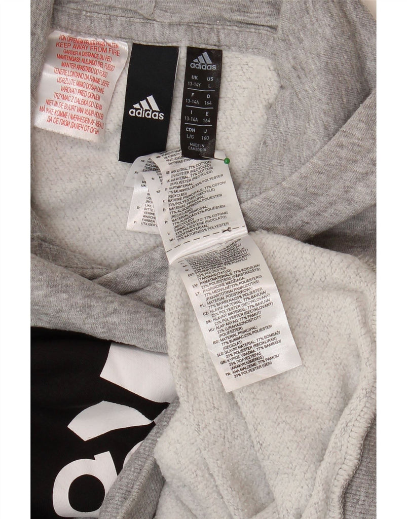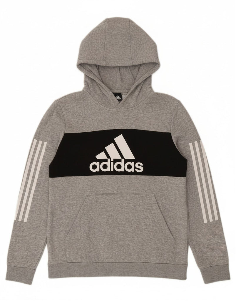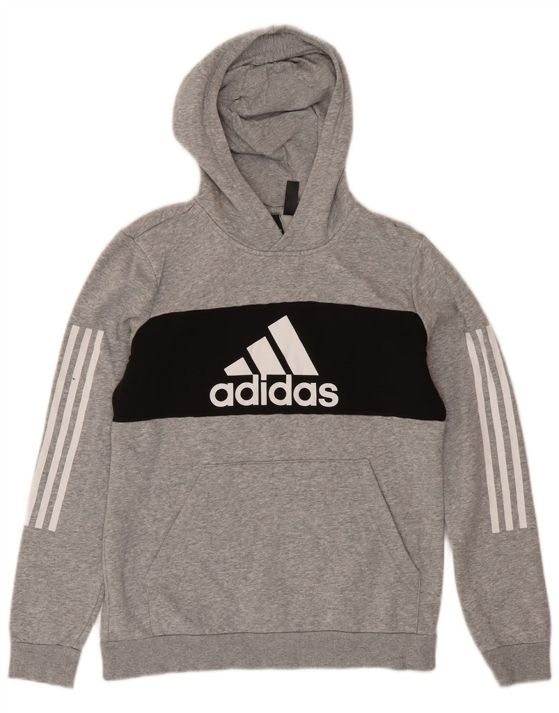 ADIDAS Boys Graphic Hoodie Jumper 13-14 Years Grey Colourblock Cotton