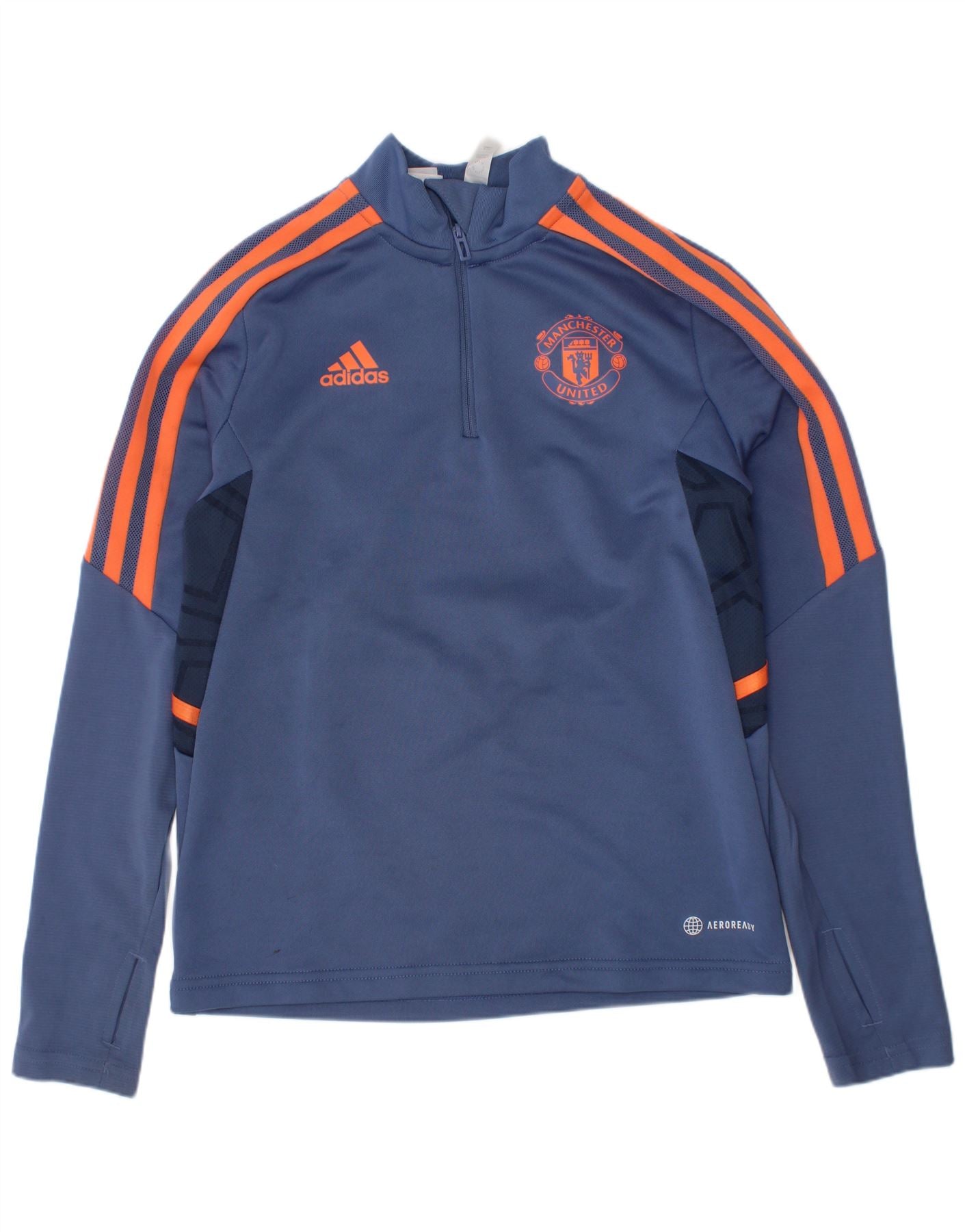 - AI Description: This Adidas boys Zip Neck Jumper Sweater is crafted from 100 percent polyester fleece, offering warmth and comfort. It features a blue main body with striking orange stripes on the long sleeves. The Adidas logo and Manchester United crest are prominently displayed. A high neck and quarter zip closure provide adjustable coverage. The athletic fit ensures ease of movement. This breathable design is ideal for sports.