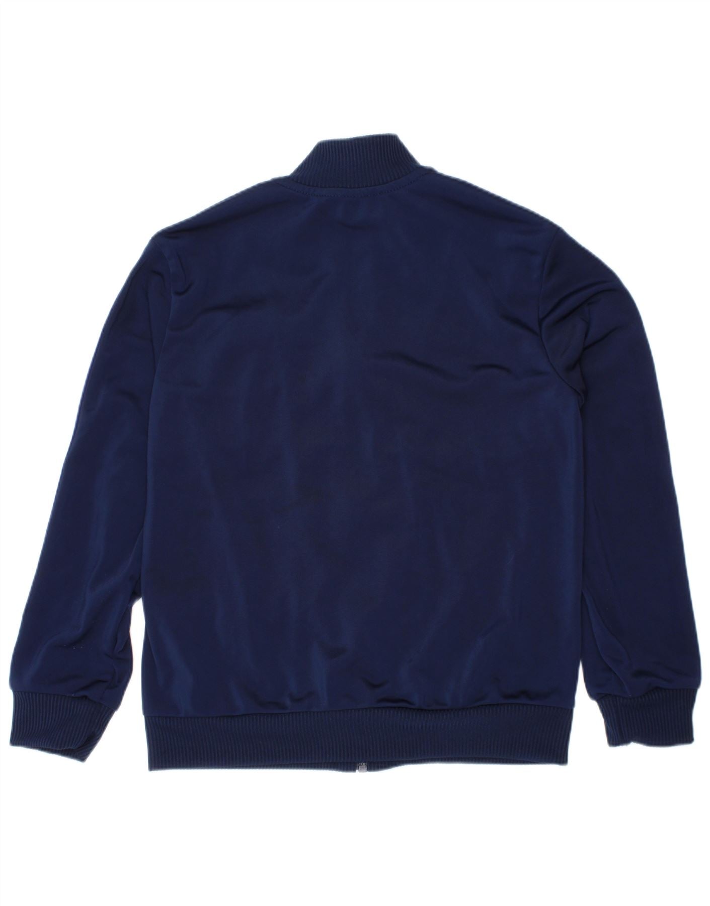 - AI Description: This Adidas boys tracksuit top jacket is crafted from smooth 100 percent polyester blended fabric. It features a high neck and long sleeves with cuffed wrists. The navy blue design includes a striking colourblock pattern with white and royal blue sections. A full zip closure runs down the front. The Manchester United logo and Adidas branding are prominently displayed. It offers a comfortable regular fit with practical pockets, perfect for active wear.