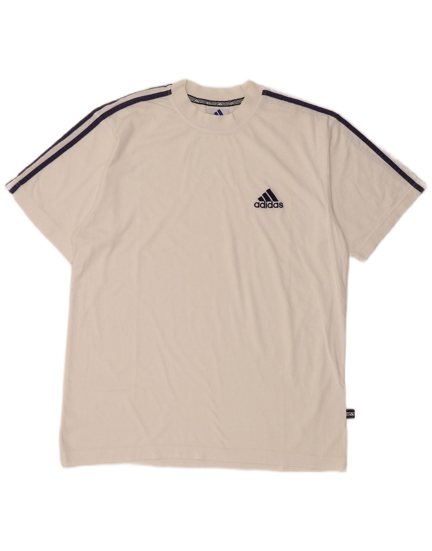 - AI Description: This Adidas men's Graphic T-Shirt Top is crafted from soft white jersey fabric. It features a classic round neck and short sleeves. The sleeves are accented with signature striped detailing. A subtle Adidas logo is embroidered on the chest. This pullover top offers a regular fit for comfortable wear, presenting a clean, sporty aesthetic.