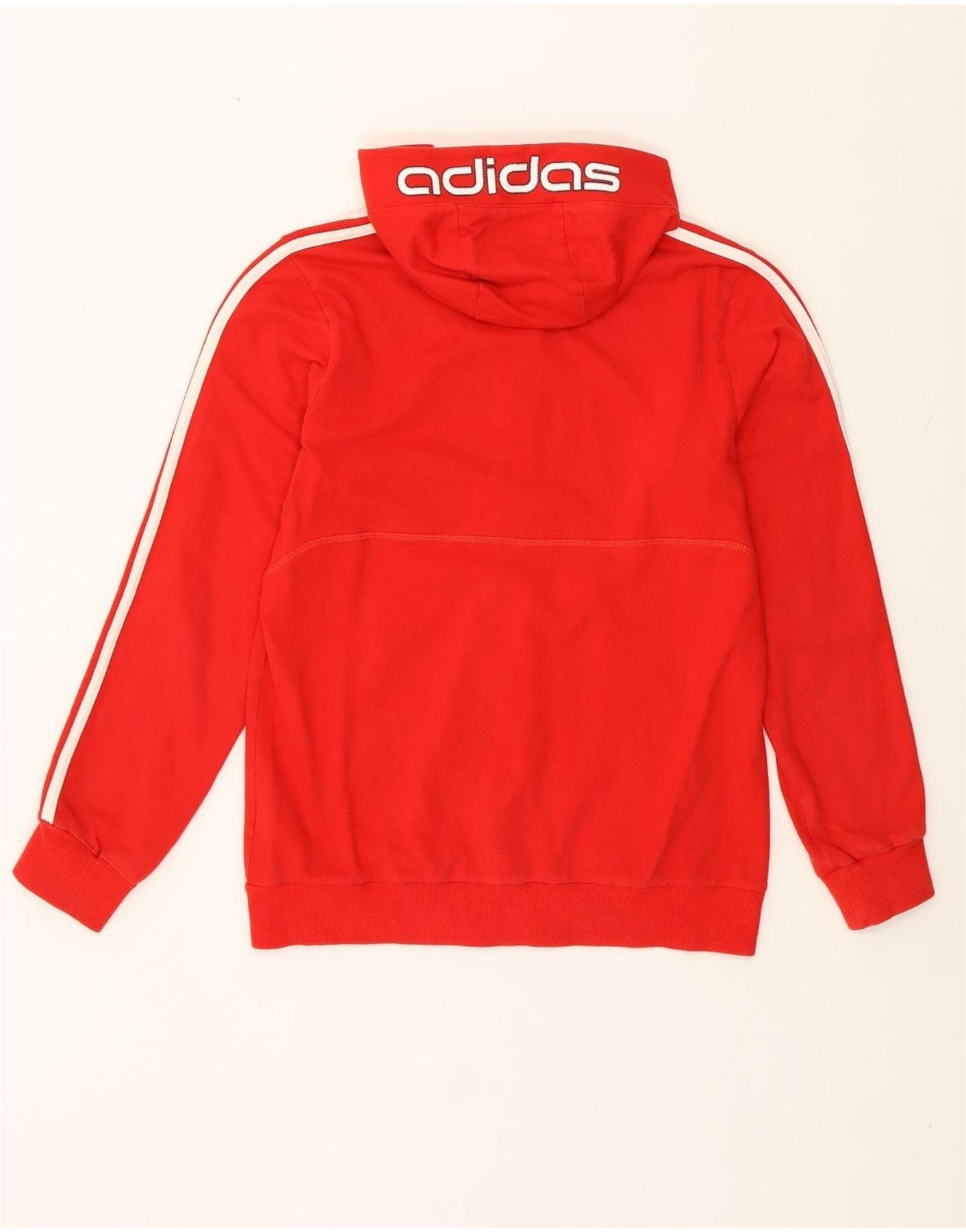 - AI Description: This Adidas girls' zip hoodie sweater is crafted from red cotton fleece. It features a regular fit, long sleeves, and a hooded neckline. The full zip closure and pockets add practicality. White stripes accent the sleeves, while the Adidas logo is displayed on the chest and hood. This sporty hoodie is ideal for everyday wear.