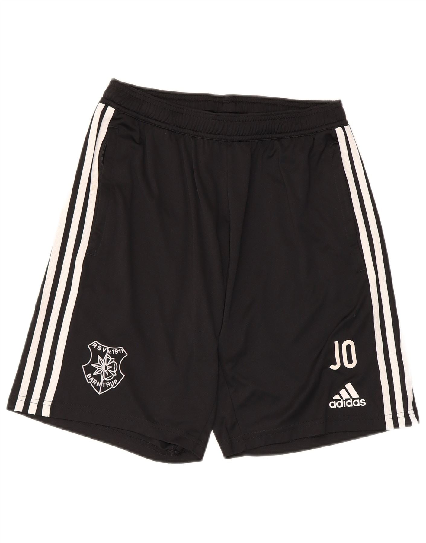 - AI Description: This Adidas mens football shorts are crafted from lightweight black polyester jersey, featuring AEROREADY technology. They have an elasticated pull-on waist for a secure, regular fit. Practical pockets are included. The design features classic white three-stripe detailing down the sides. An Adidas logo and JO initials are present, alongside the RSV Barntrup team crest. These athletic shorts are ideal for sports performance.