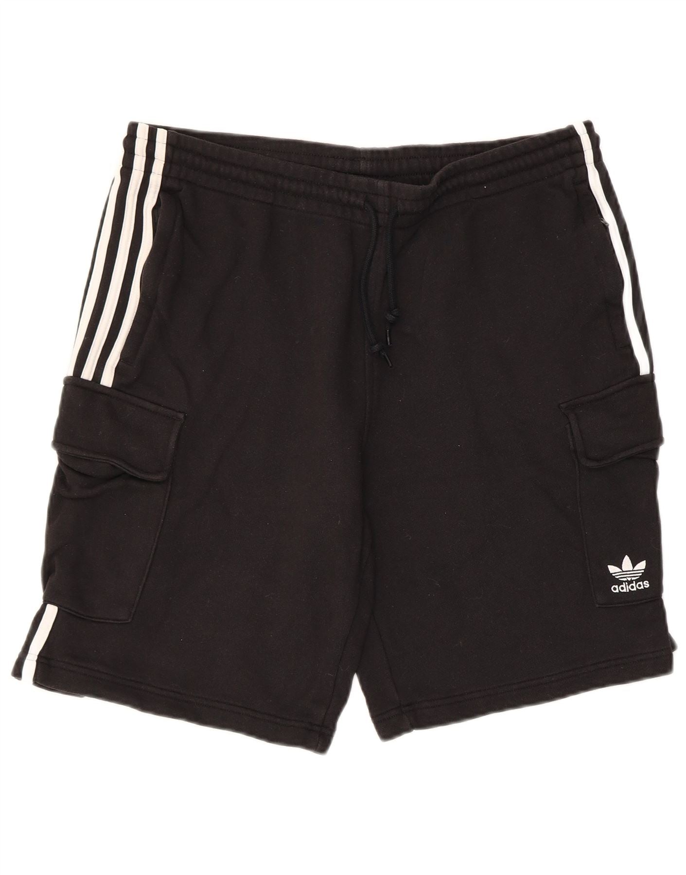 - AI Description: This Adidas mens Cargo Shorts are crafted from a comfortable black cotton blend jersey. They feature a regular comfort fit with an elasticated drawstring waist. Classic white three stripes run down the sides. Practical cargo pockets are positioned on each leg. The Adidas Trefoil logo is subtly placed. These shorts offer both style and ease for everyday wear.