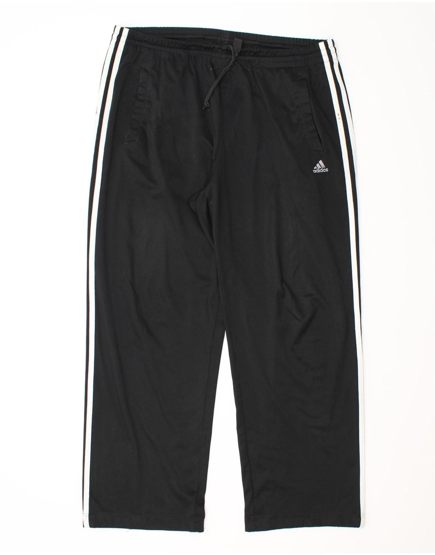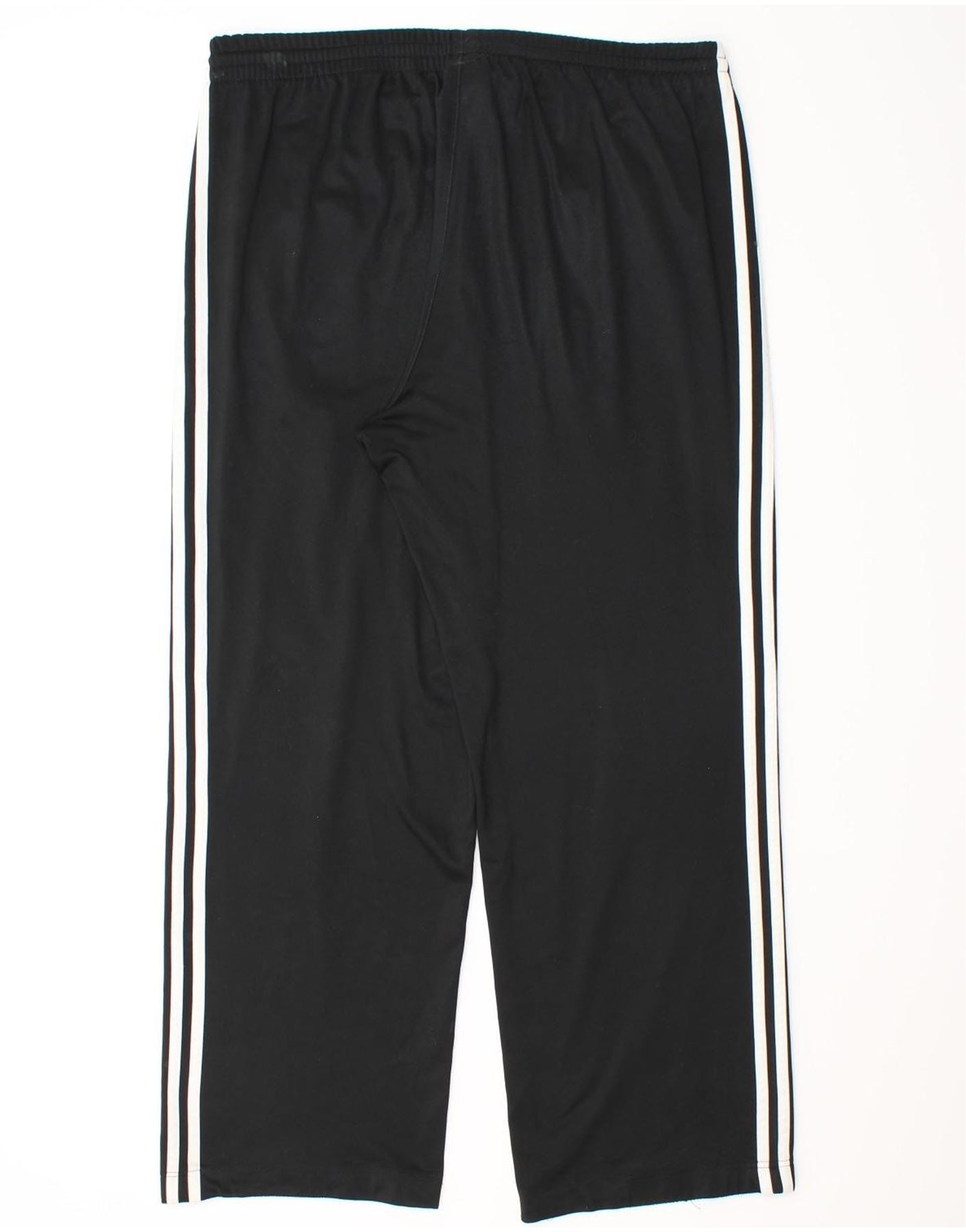 - AI Description: This Adidas mens casual trousers are crafted from black 100 percent polyester knit fabric. They feature a comfortable elastic waist with a practical drawstring closure. The regular fit and straight leg design offer ease of movement. White stripes run down the sides, adding a classic sports aesthetic. An Adidas logo provides a subtle branded accent. These breathable joggers are perfect for sports or casual wear.