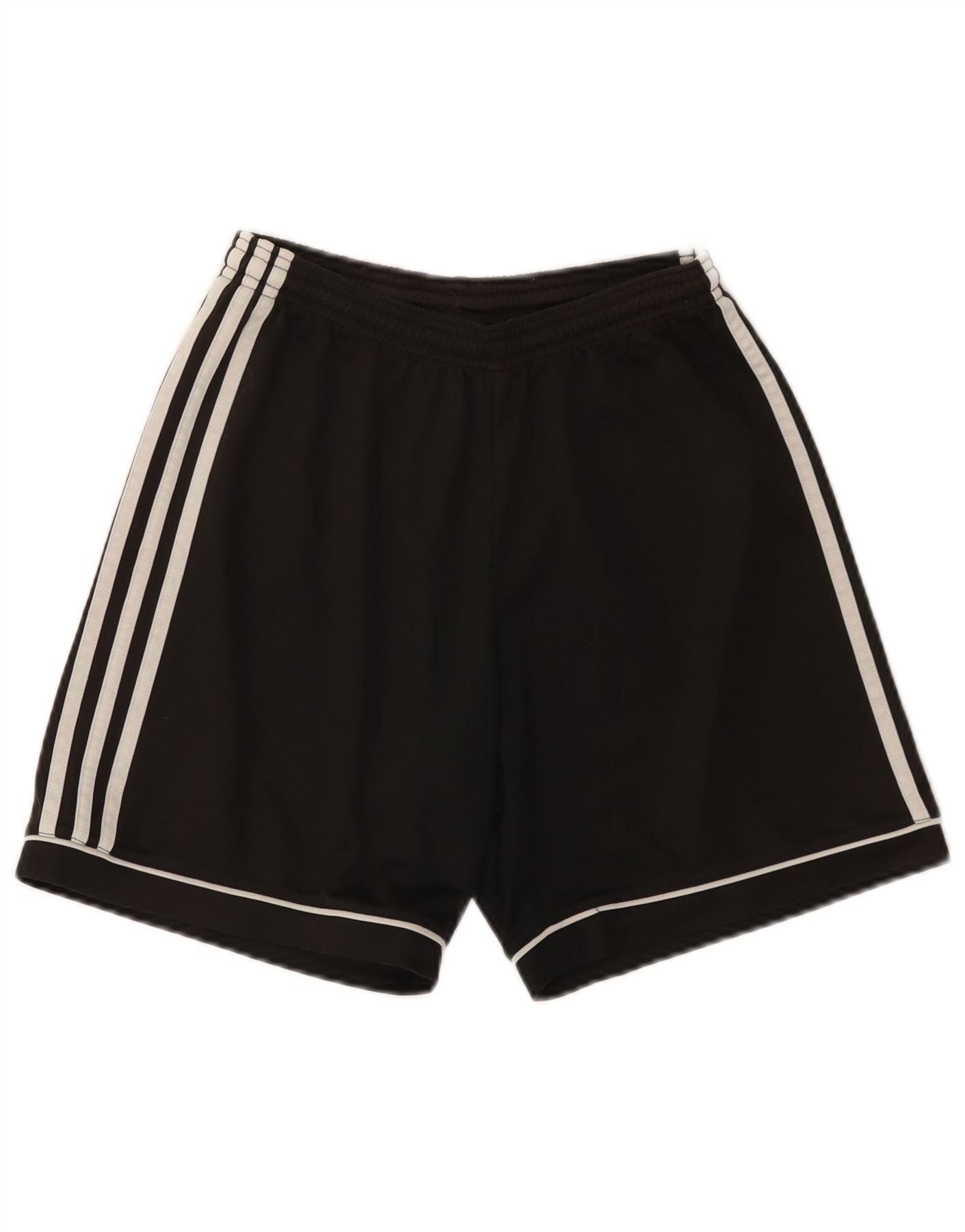 - AI Description: This Adidas mens shorts are crafted from a breathable blended fabric in classic black. They feature an elasticated pull-on waist for comfort and an athletic regular fit. Three iconic white stripes run down each side, complemented by white piping along the hem. The Adidas logo is subtly placed on the leg. Climalite technology ensures moisture-wicking performance, ideal for football or sports.