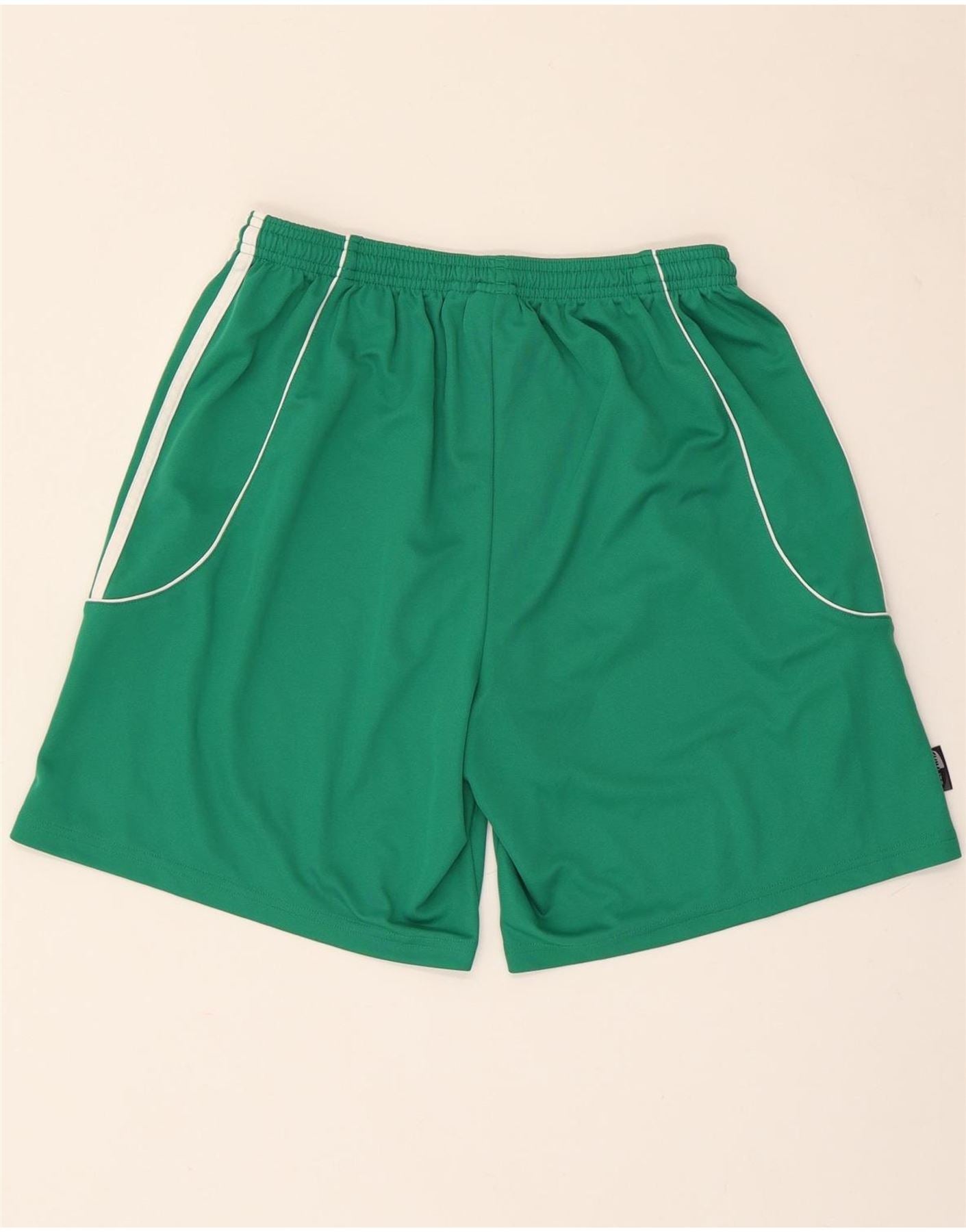 - AI Description: This Adidas mens football shorts are crafted from smooth green jersey fabric. The Climalite material ensures comfort and breathability during activity. It features an elasticated waist with a pull-on design for an athletic fit. White piping details and the iconic three stripes adorn the sides. A white Adidas logo is printed on the leg, completing the sporty look.