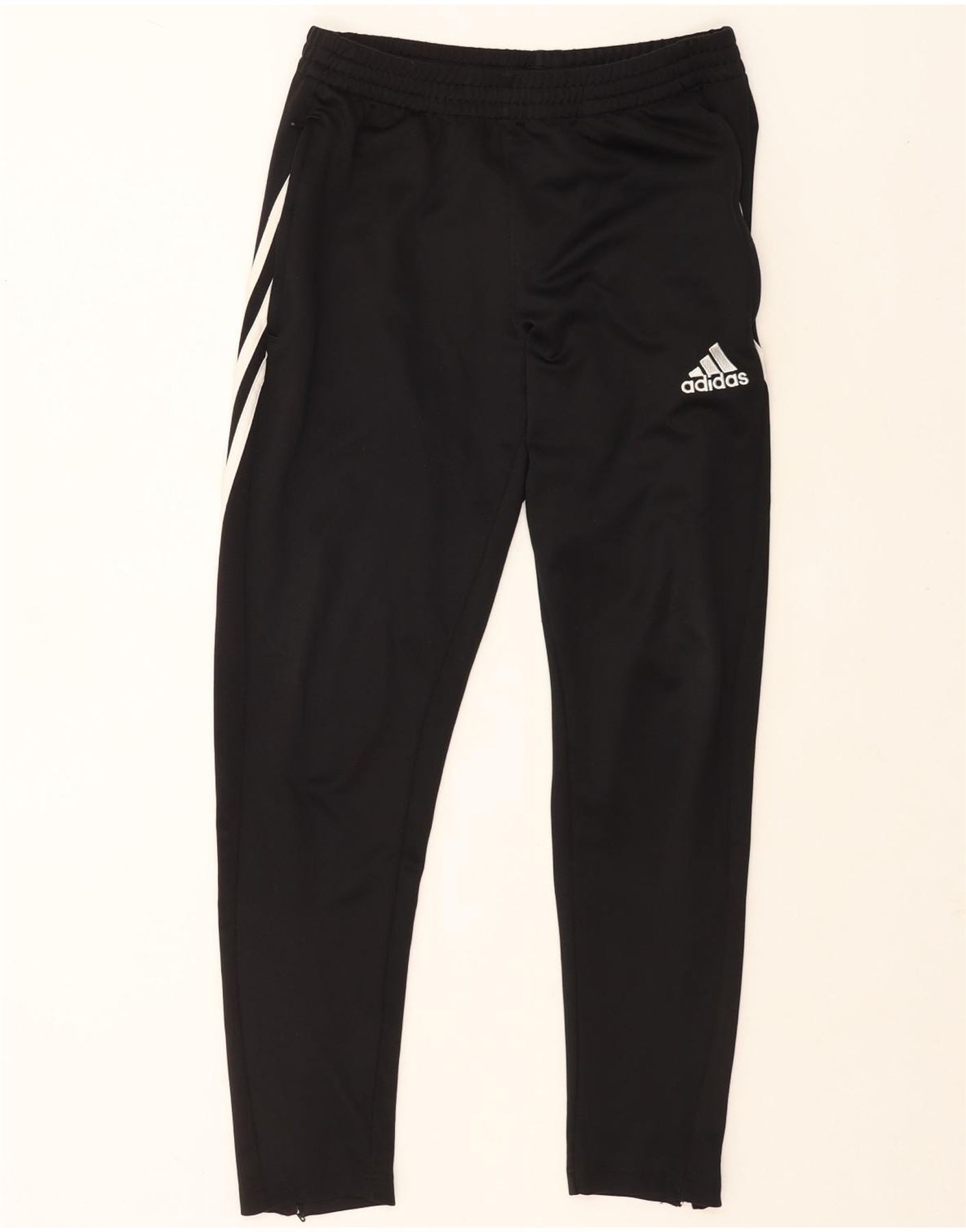 - AI Description: These Adidas men's joggers are crafted from black Climalite polyester jersey, ensuring comfort and performance. They feature an athletic fit with a pull-on elastic waist and practical pockets. The iconic three white stripes run down the sides, adding a signature sports detail. Ankle zips provide adjustable ventilation and ease of wear. This design is perfect for football or casual athletic styling.