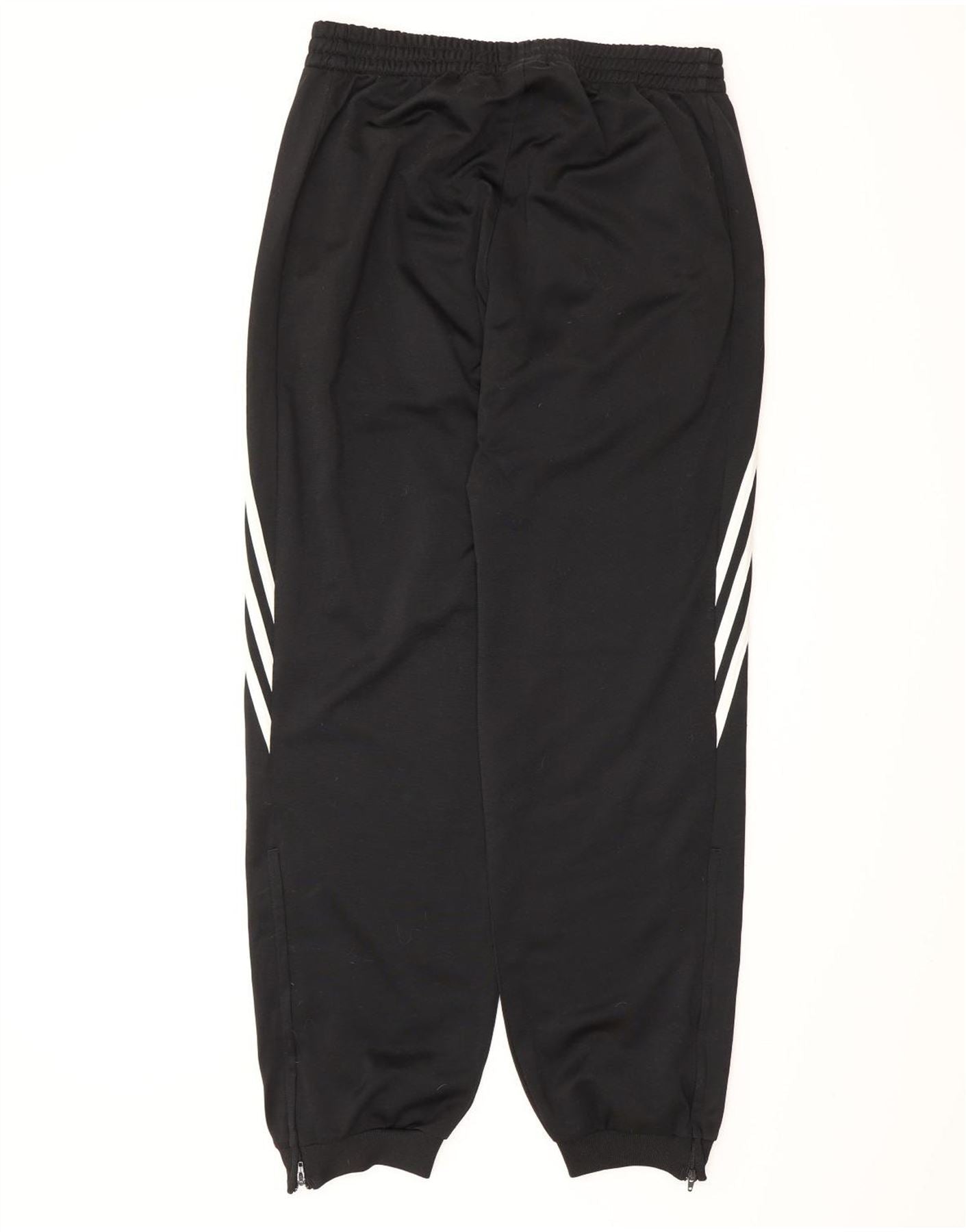- AI Description: This Adidas mens tracksuit trousers joggers are crafted from black jersey fabric, offering a smooth, comfortable feel. They feature a regular fit with an elasticated pull-on waist. The jogger style tapers towards the ankle. White Adidas stripes run down the sides. A white Adidas logo and FE graphic add distinctive detailing. Practical pockets and ankle zips complete the design, ideal for sports.