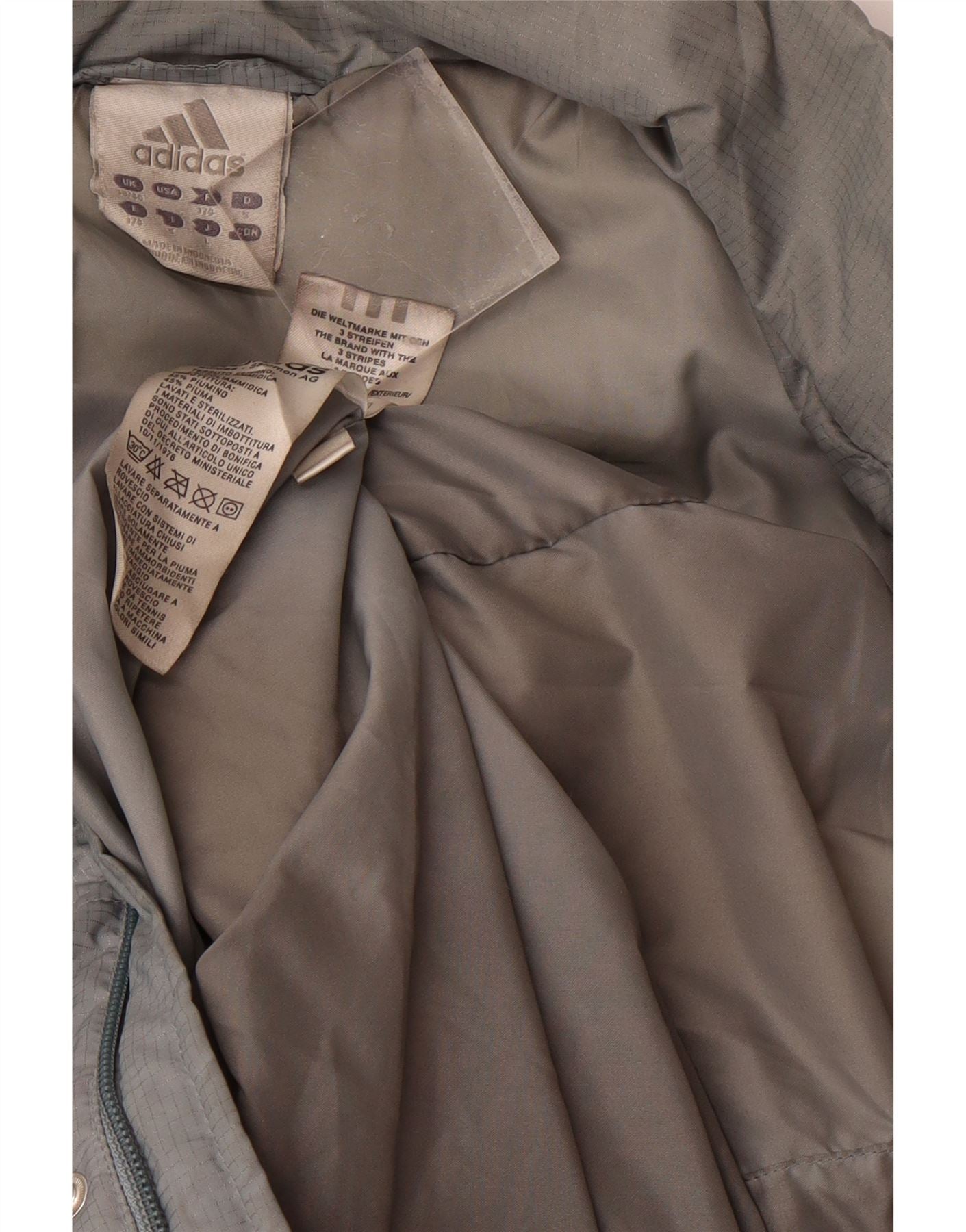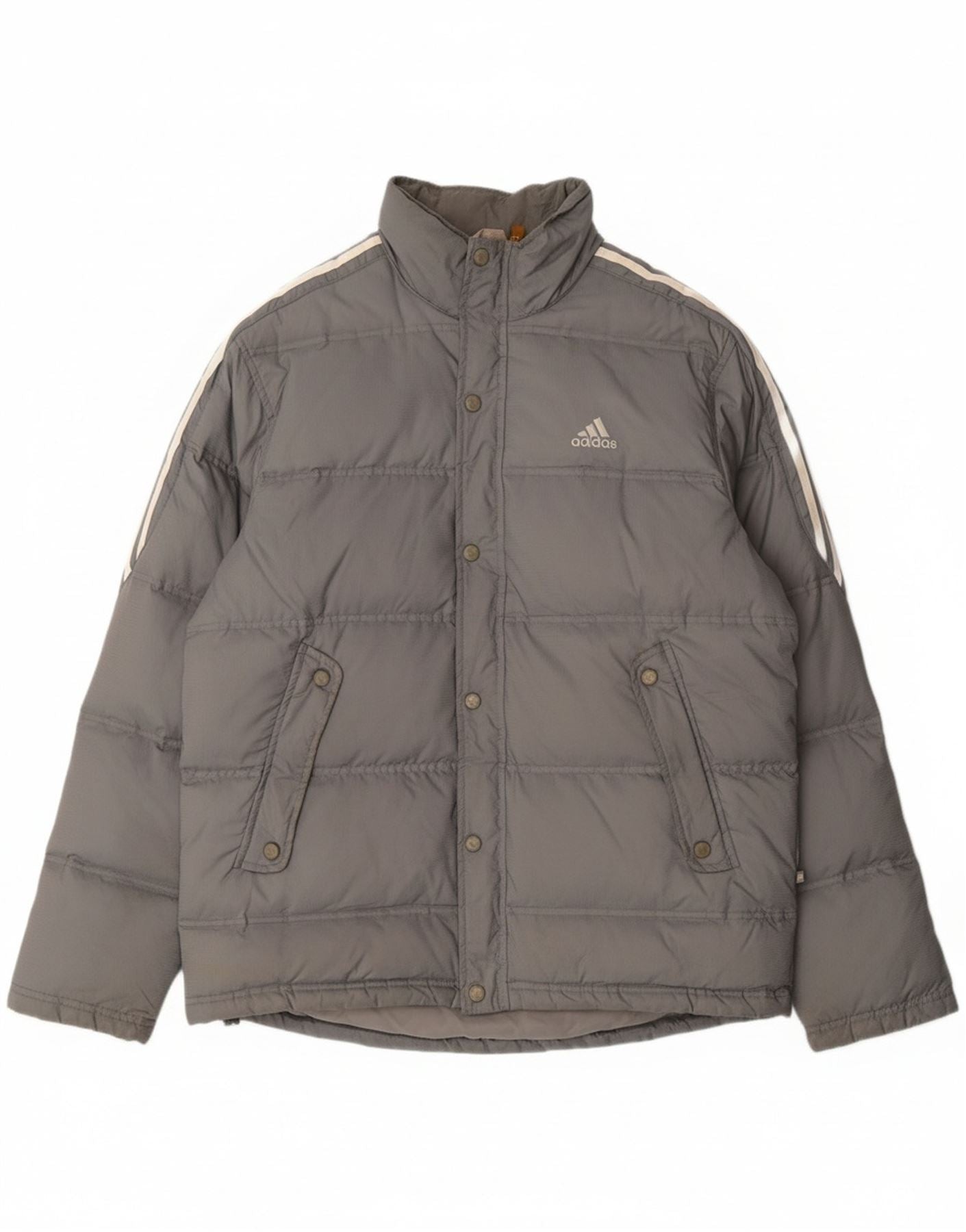 - AI Description: This Adidas mens padded jacket is crafted from durable grey nylon with a thermal down filling. It features a collared neckline and a full zip closure for practical wear. Long sleeves and a regular fit offer comfortable coverage. Multiple pockets provide useful storage. The jacket is windproof, making it ideal for outdoor activities, and finished with a subtle logo accent.