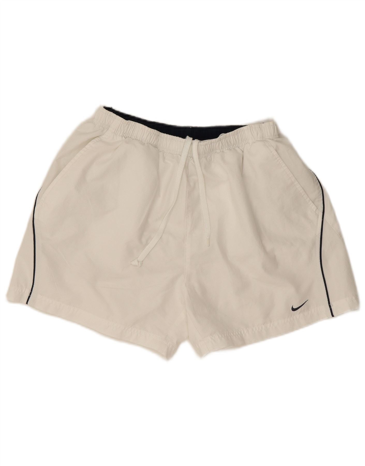 - AI Description: This Nike mens casual shorts are crafted from lightweight white woven polyester. They feature an elasticated waistband with a drawstring for a comfortable pull-on fit. The athletic regular fit includes practical pockets and a full lining for enhanced comfort. A subtle Nike logo accent completes the sporty design, perfect for active wear.