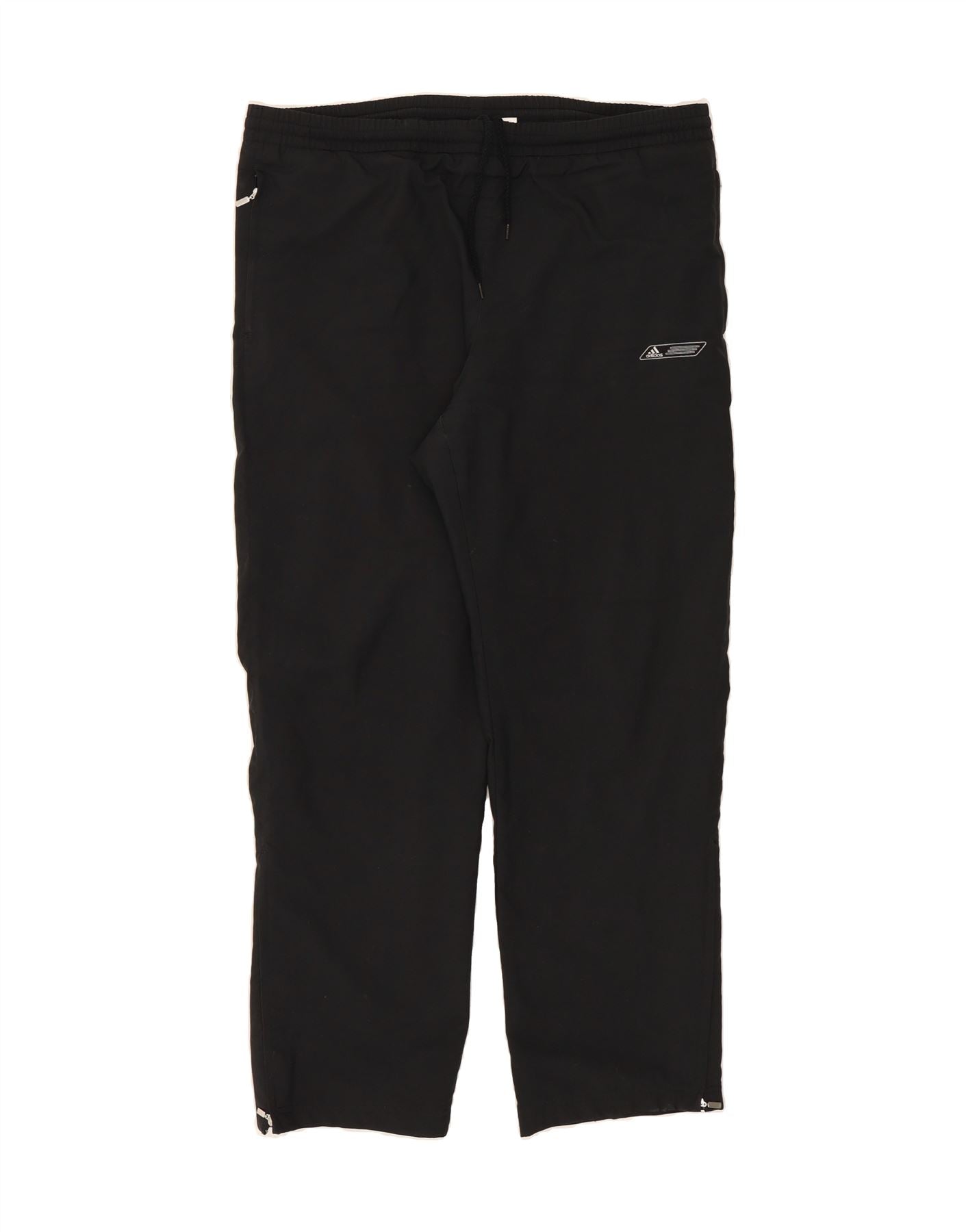 - AI Description: Adidas men's black sports trousers in excellent pre-owned condition. Crafted from a woven fabric, these regular fit trousers feature a drawstring closure, adjustable elastic waist, and handy pockets. The design is accented with a subtle logo. Size L/G. Minor defects include loose stitching on the waistband, slight discoloration on the back, and visible wear on the tag.