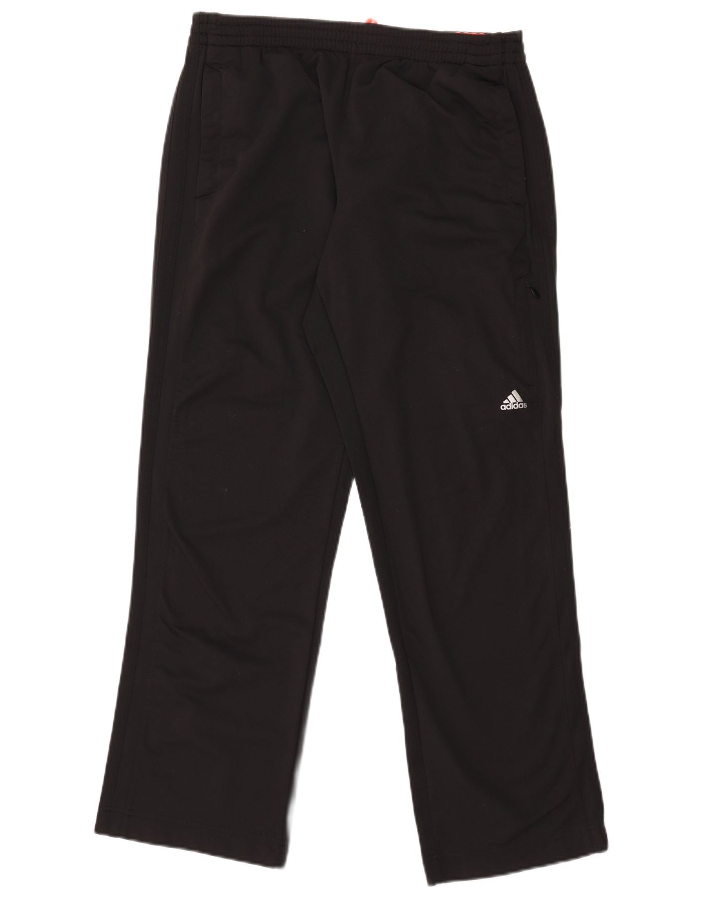 - AI Description: This Adidas mens tracksuit trousers are crafted from a black blended fabric, offering a smooth and comfortable feel. They feature a regular fit with an elasticated pull-on waist for ease. The straight leg design ensures unrestricted movement. Practical zipped pockets provide secure storage. A subtle Adidas logo adds a signature sports accent. Ideal for training or casual wear, these trousers combine functionality with classic athletic style.