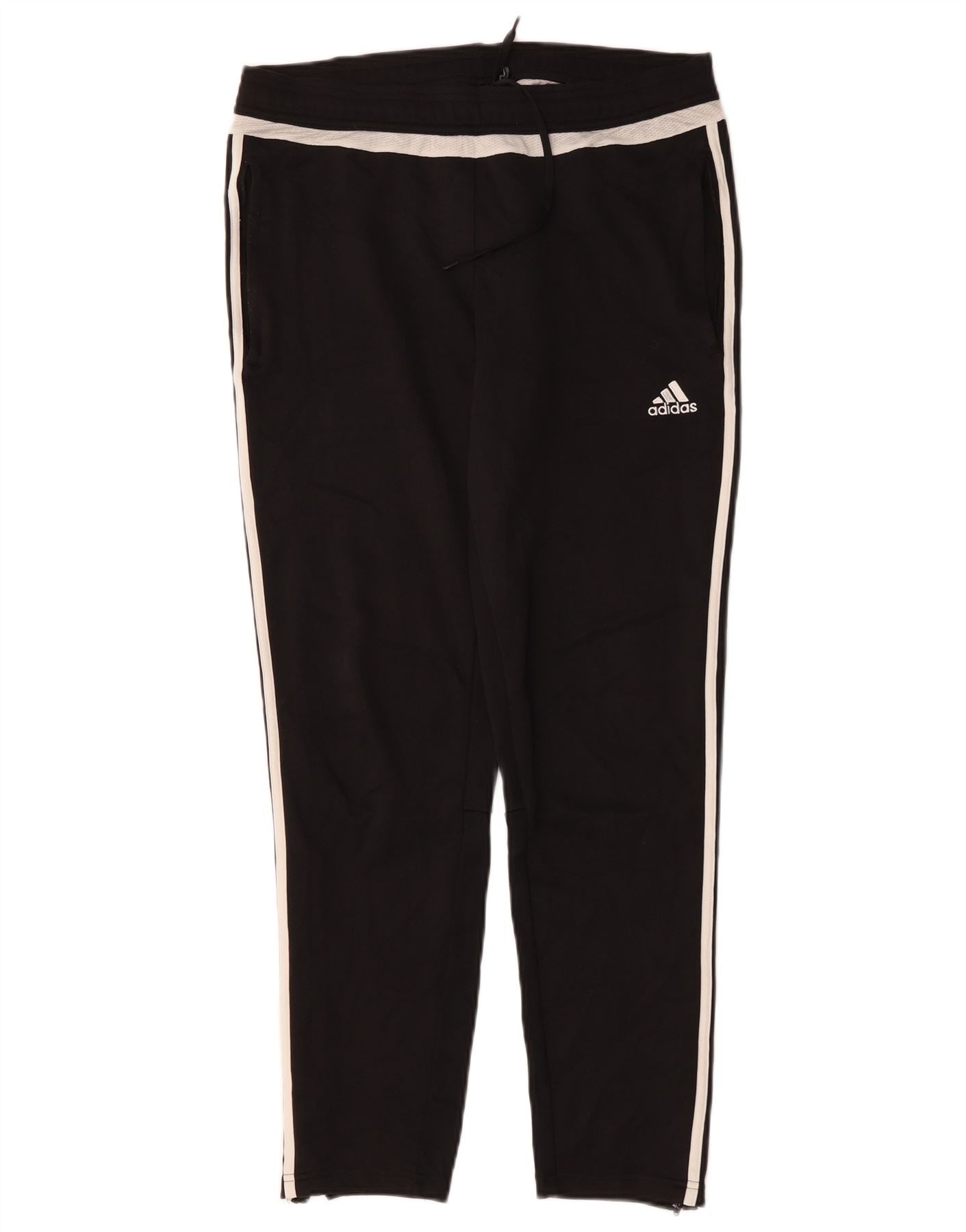 - AI Description: This Adidas womens tracksuit trousers are crafted from black polyester jersey for athletic comfort. The elasticated drawstring waist ensures a secure, adjustable fit. White stripes run down the sides, adding a classic sporty detail. Ankle zips provide versatile styling and ease of wear. The regular fit and Climacool technology offer optimal performance and breathability.