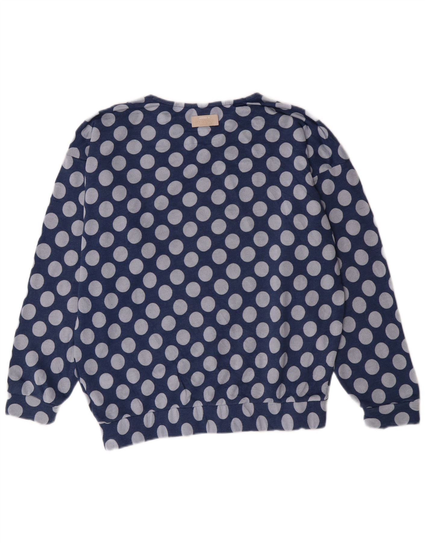 - AI Description: This Adidas women's sweatshirt jumper is made from a polyester and cotton knit blend. It features a bold navy blue and light blue polka dot pattern. The round neckline and long sleeves create a classic silhouette. This pullover style has a regular fit for comfortable wear. The graphic polka dot pattern adds a playful touch to this sporty Trefoil Crew Sweatshirt.