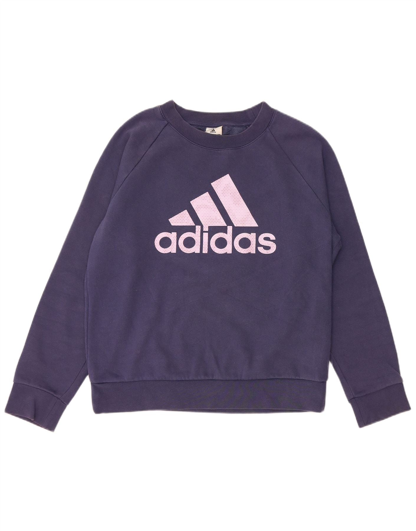 - AI Description: This Adidas womens sweatshirt jumper is crafted from soft navy blue jersey fabric. It features a classic round neck and long sleeves. The pullover design offers a comfortable regular fit. A prominent graphic logo in a contrasting colour adorns the front. Ribbed cuffs and hem complete the athletic style, perfect for casual wear.