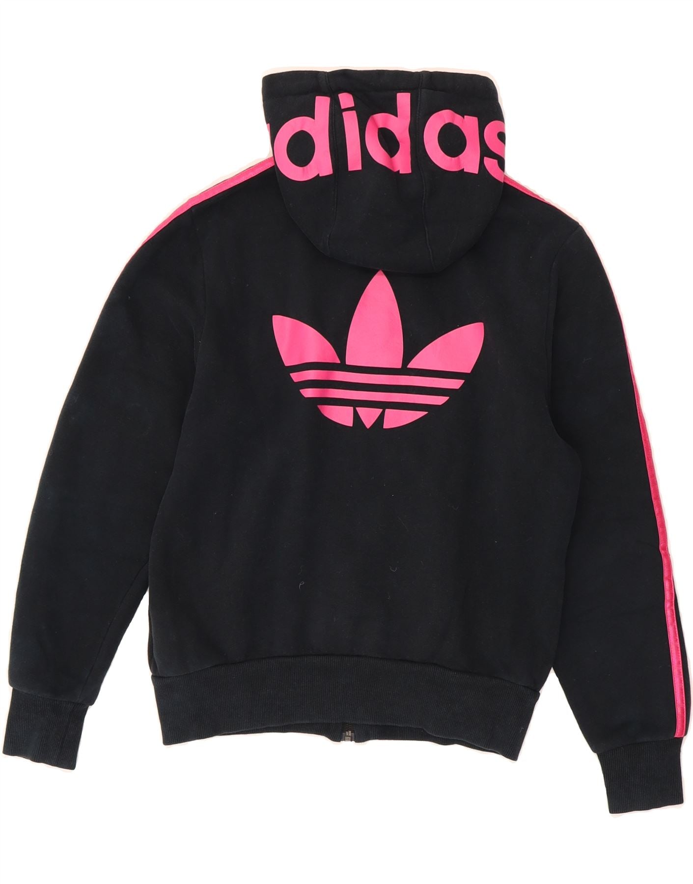 - AI Description: This Adidas women's zip hoodie sweater is a sporty essential. Crafted from a comfortable cotton-blend fleece (80% cotton, 20% polyester shell; 100% cotton hood lining), it features a regular fit, long sleeves, and a round neck. The black hoodie boasts a striped pattern and the iconic Adidas logo. It has a full zip closure and practical pockets. Pre-owned in excellent condition, this size 38 hoodie is perfect for casual wear.