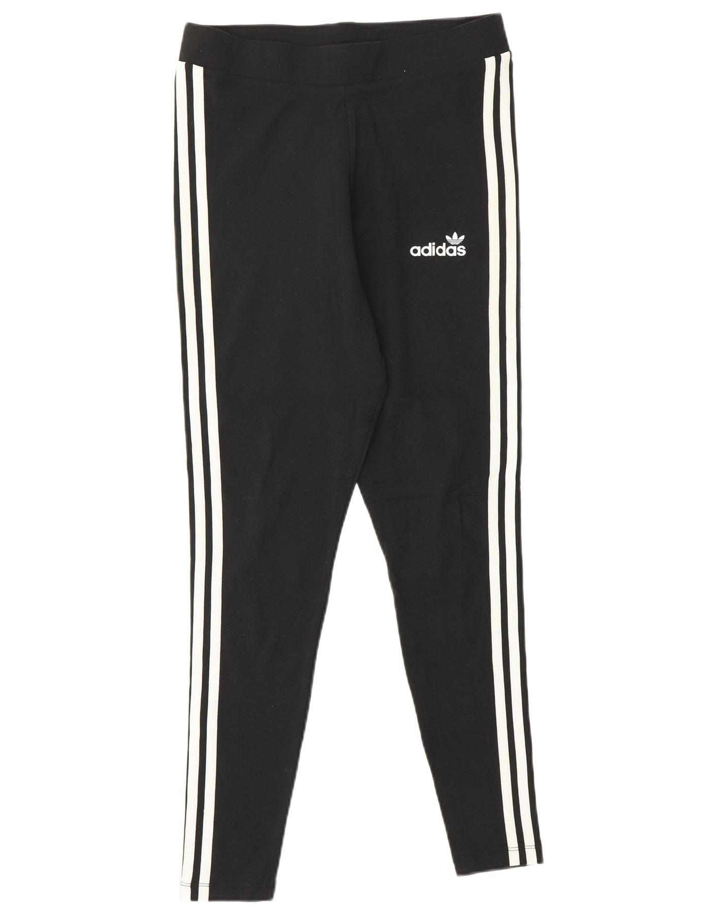 - AI Description: This Adidas womens leggings are crafted from soft black jersey fabric, offering stretch and comfort. They feature a pull-on design with an elasticated waist for a secure, slim fit. Classic white stripes run down each leg, complementing the iconic Adidas logo detail. This sports style provides both flexibility and a sleek silhouette, perfect for active wear.