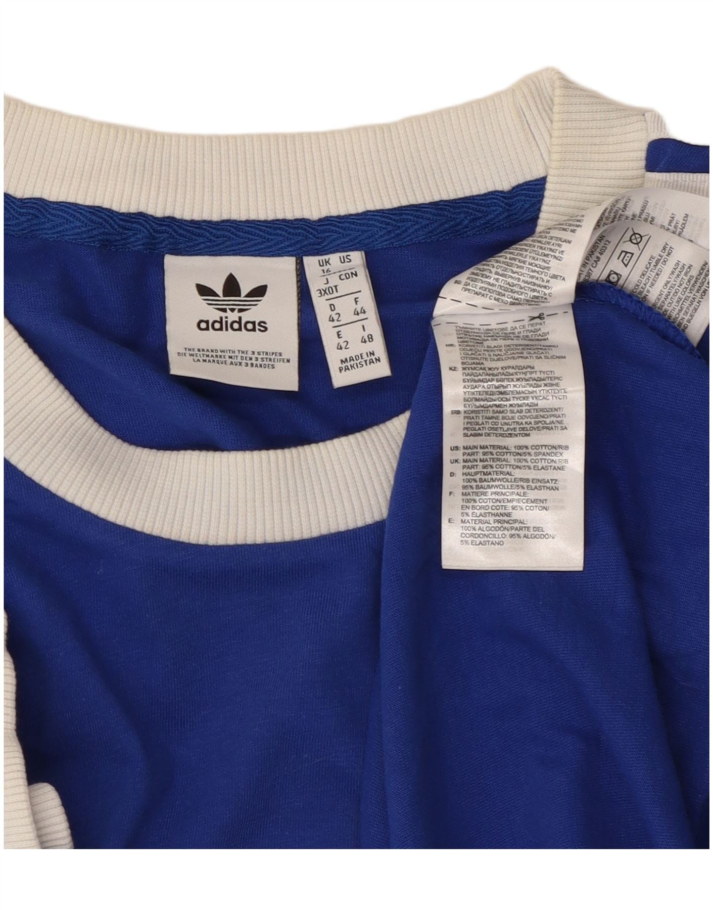 - AI Description: This Adidas womens T-shirt top is crafted from soft blue cotton jersey. It features a classic round neck and short sleeves with white ringer details. The iconic Adidas logo is printed on the chest. Three white stripes run along each sleeve, adding a signature athletic touch. Its regular fit ensures comfort and breathability for everyday wear.