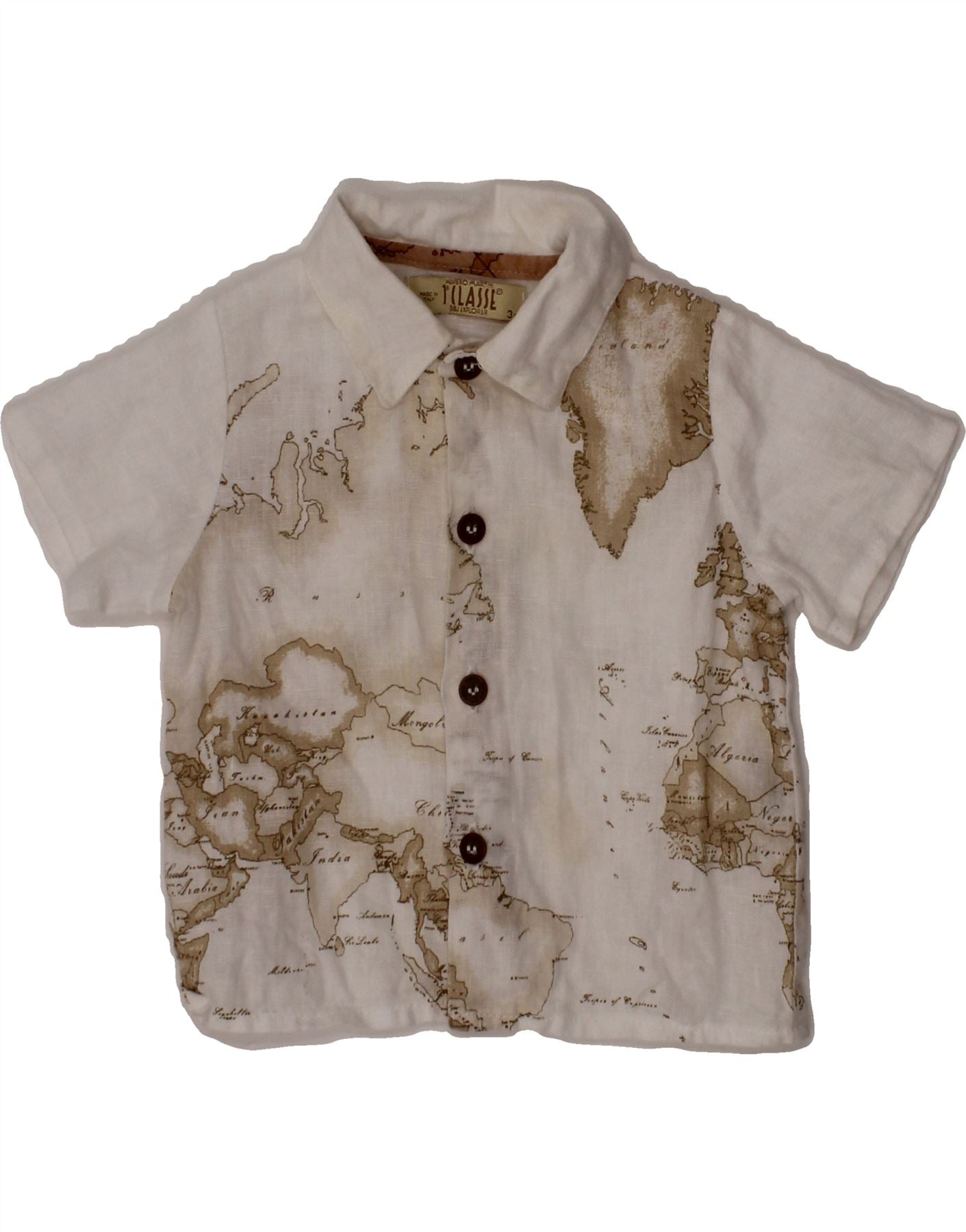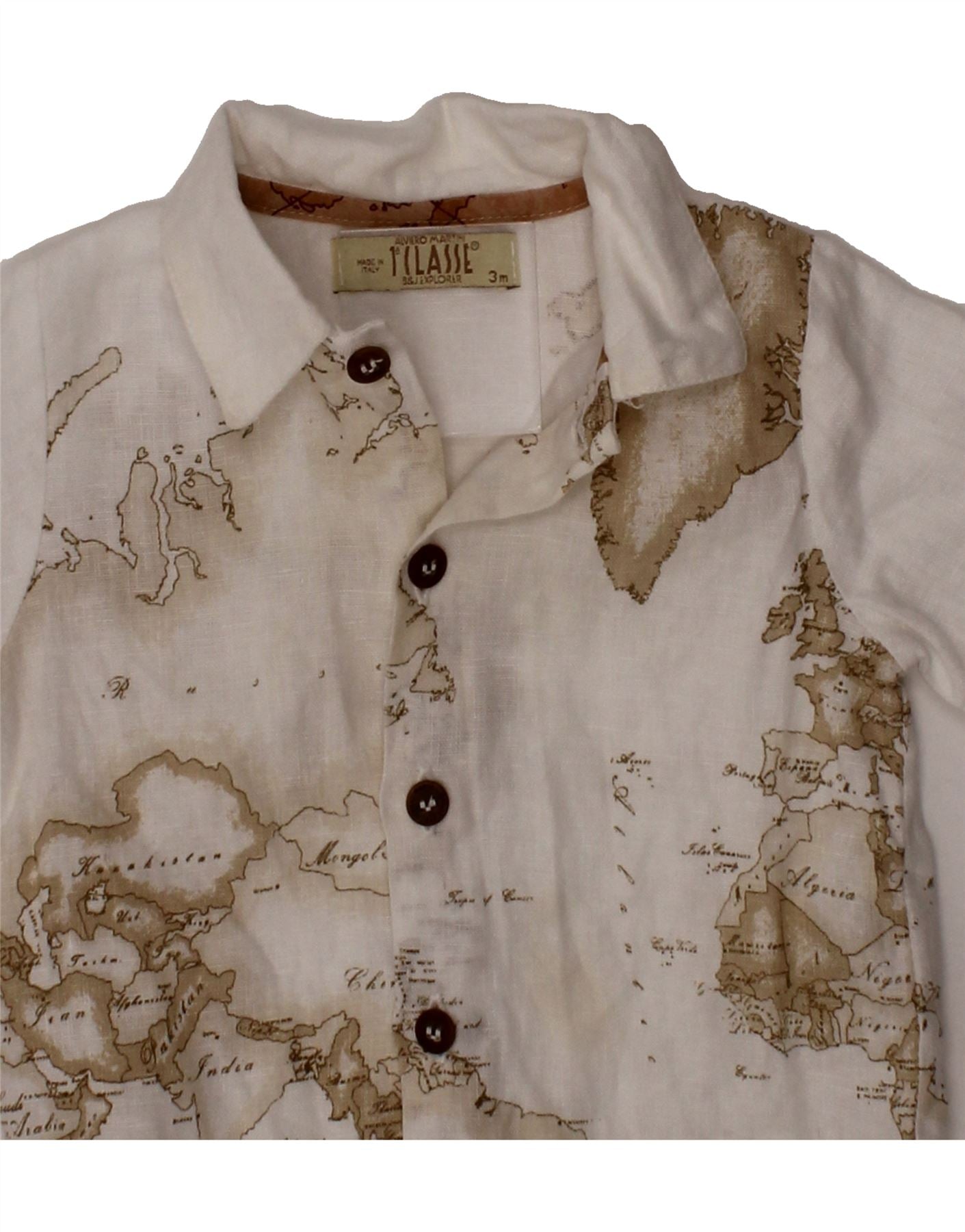 - AI Description: This ALVIERO MARTINI boys' shirt is a classic style in white linen, perfect for smart-casual wear. Featuring a geometric pattern and short sleeves, it has a collared neckline and button closure. The regular fit ensures comfort, while button accents add a refined touch. Pre-owned in good condition, it shows minor discoloration on some buttons. Size 3M.