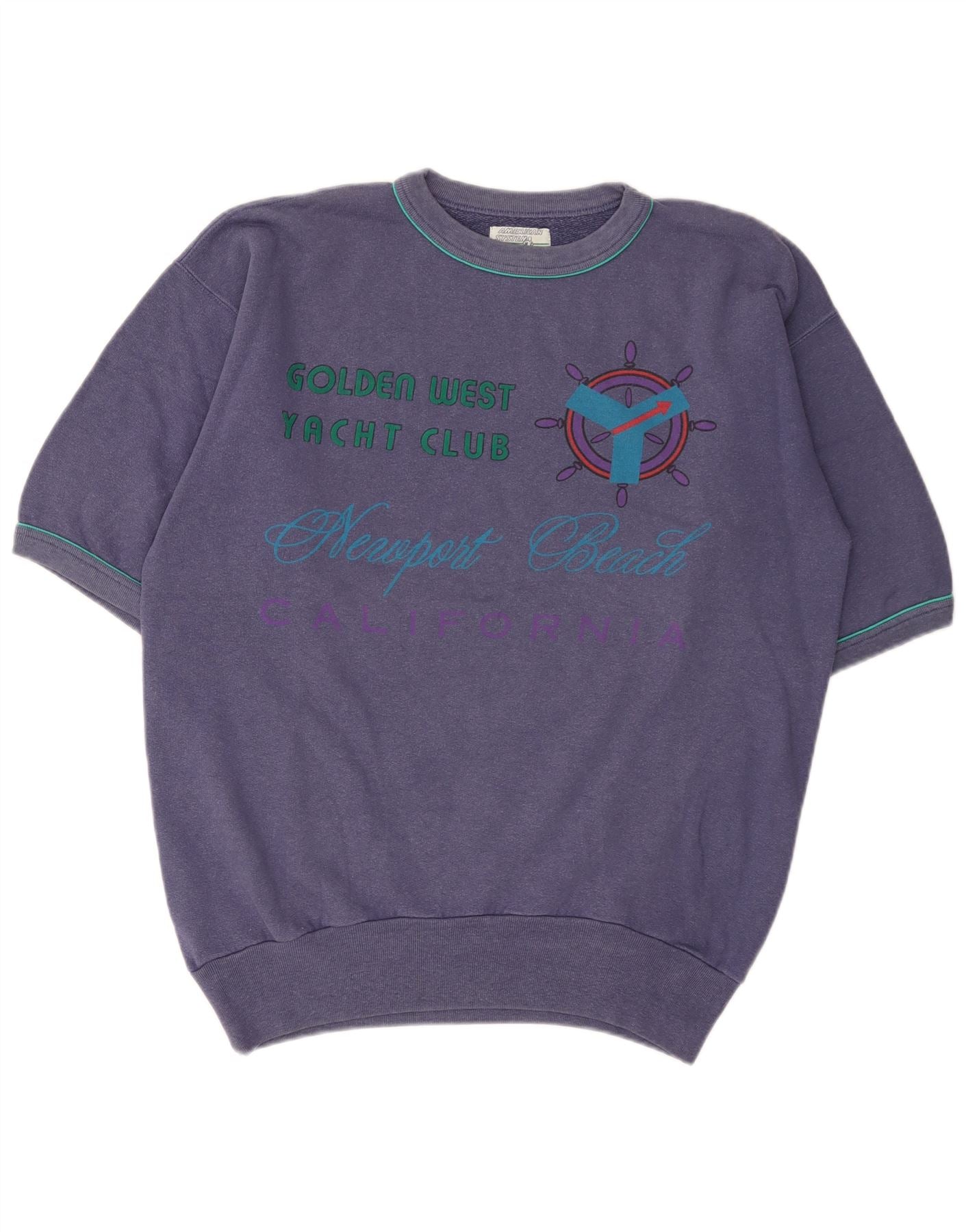 - AI Description: This American System mens sweatshirt jumper is crafted from a soft cotton acrylic blend jersey fabric. It features a rich purple hue with a prominent Golden West Yacht Club graphic on the front. The round neck and short sleeves offer a relaxed silhouette. Cuffed sleeves and hem ensure a neat finish. This pullover style provides a comfortable regular fit, perfect for a casual nautical look.