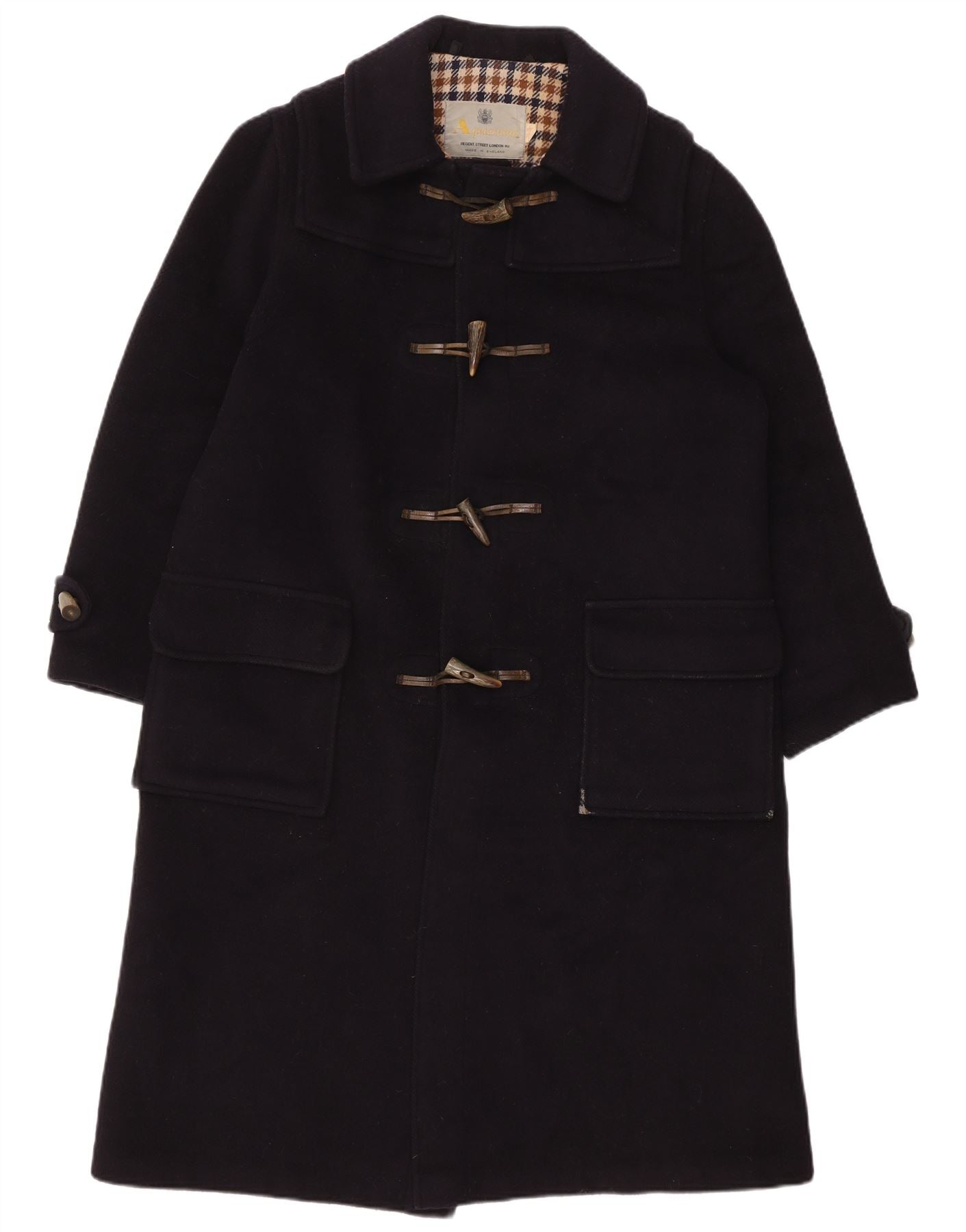 - AI Description: This Aquascutum mens duffle coat is crafted from luxurious 100 percent Pure New Wool. Its heavyweight woven fabric offers exceptional warmth and a rich texture. The classic regular fit provides comfortable wear. It features a collared neckline and long sleeves. A practical hood adds extra protection. The front closure uses traditional tie fastenings with buckle accents. Functional pockets complete the design, embodying a timeless style.